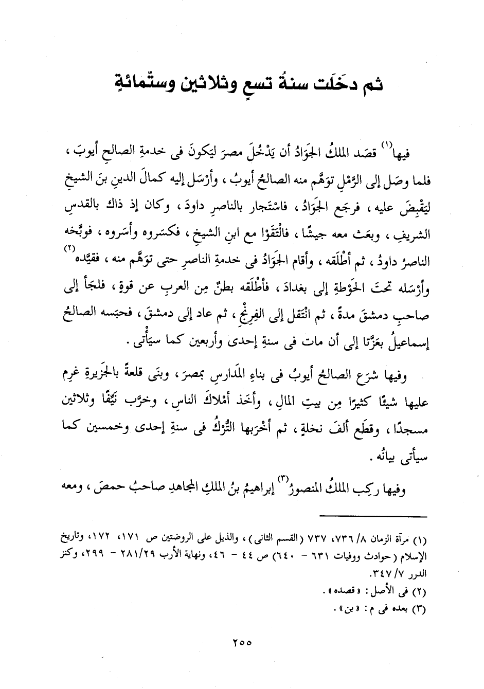 فِيهَا قَصَدَ الْمَلِكُ الْجَوَادُ أَنْ يَدْخُلَ مِصْرَ لِيَكُونَ فِي خِدْمَةِ الصَّالِحِ أَيُّوبَ، فَلَمَّا وَصَلَ إِلَى الرَّمْلِ تَوَهَّمَ مِنْهُ الصَّالِحُ أَيُّوبُ، وَأَرْسَلَ إِلَيْهِ كَمَالَ الدِّينِ بْنَ الشَّيْخِ لِيَقْبِضَ عَلَيْهِ، فَرَجَعَ الْجَوَادُ، فَاسْتَجَارَ بِالنَّاصِرِ دَاوُدَ، وَكَانَ إِذْ ذَاكَ بِالْقُدْسِ الشَّرِيفِ، وَبَعَثَ مَعَهُ جَيْشًا، فَالْتَقَوْا مَعَ ابْنِ الشَّيْخِ، فَكَسَرُوهُ وَأَسَرُوهُ، فَوَبَّخَهُ النَّاصِرُ دَاوُدُ، ثُمَّ أَطْلَقَهُ، وَأَقَامَ الْجَوَادُ فِي خِدْمَةِ النَّاصِرِ حَتَّى تَوَهَّمَ مِنْهُ، فَقَيَّدَهُ وَأَرْسَلَهُ تَحْتَ الْحَوْطَةِ إِلَى بَغْدَادَ، فَأَطْلَقَهُ بَطْنٌ مِنَ الْعَرَبِ عَنْ قُوَّةٍ، فَلَجَأَ إِلَى صَاحِبِ دِمَشْقَ مُدَّةً، ثُمَّ انْتَقَلَ إِلَى الْفِرِنْجِ، ثُمَّ عَادَ إِلَى دِمَشْقَ، فَحَبَسَهُ الصَّالِحُ إِسْمَاعِيلُ بِعَزَّتَا إِلَى أَنْ مَاتَ فِي سَنَةِ إِحْدَى وَأَرْبَعِينَ كَمَا سَيَأْتِي.