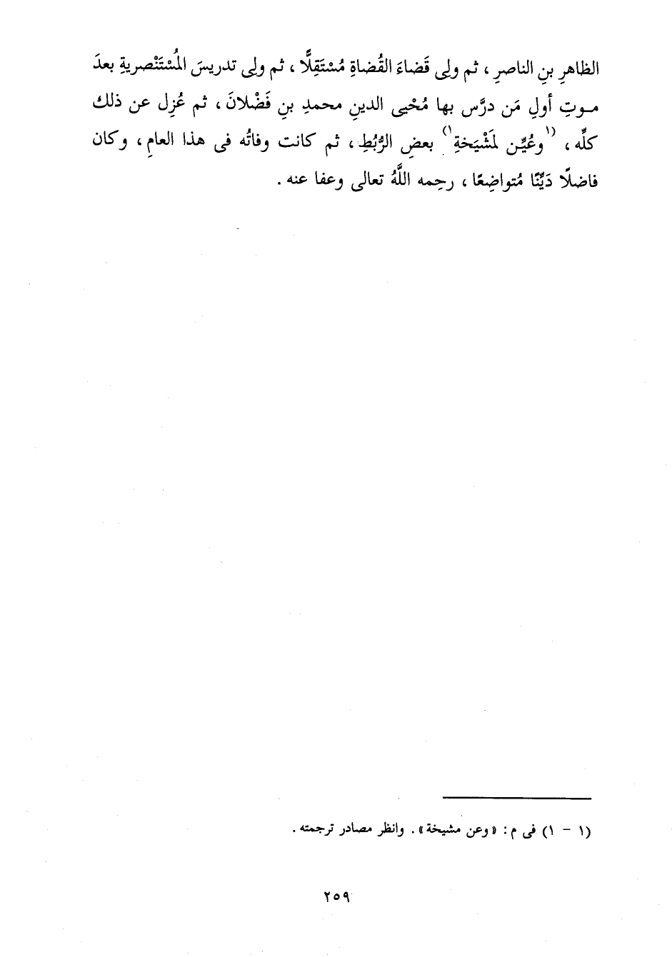 الظَّاهِرِ بْنِ النَّاصِرِ، ثُمَّ وَلِيَ قَضَاءَ الْقُضَاةِ مُسْتَقِلًّا، ثُمَّ وَلِيَ تَدْرِيسَ الْمُسْتَنْصِرِيَّةِ بَعْدَ مَوْتِ أَوَّلِ مَنْ دَرَّسَ بِهَا مُحْيِي الدِّينِ مُحَمَّدِ بْنِ فَضْلَانَ، ثُمَّ عُزِلَ عَنْ ذَلِكَ كُلِّهِ، وَعُيِّنَ لِمَشْيَخَةِ بَعْضِ الرُّبُطِ، ثُمَّ كَانَتْ وَفَاتُهُ فِي هَذَا الْعَامِ، وَكَانَ فَاضِلًا دَيِّنًا مُتَوَاضِعًا، رَحِمَهُ اللَّهُ تَعَالَى وَعَفَا عَنْهُ.