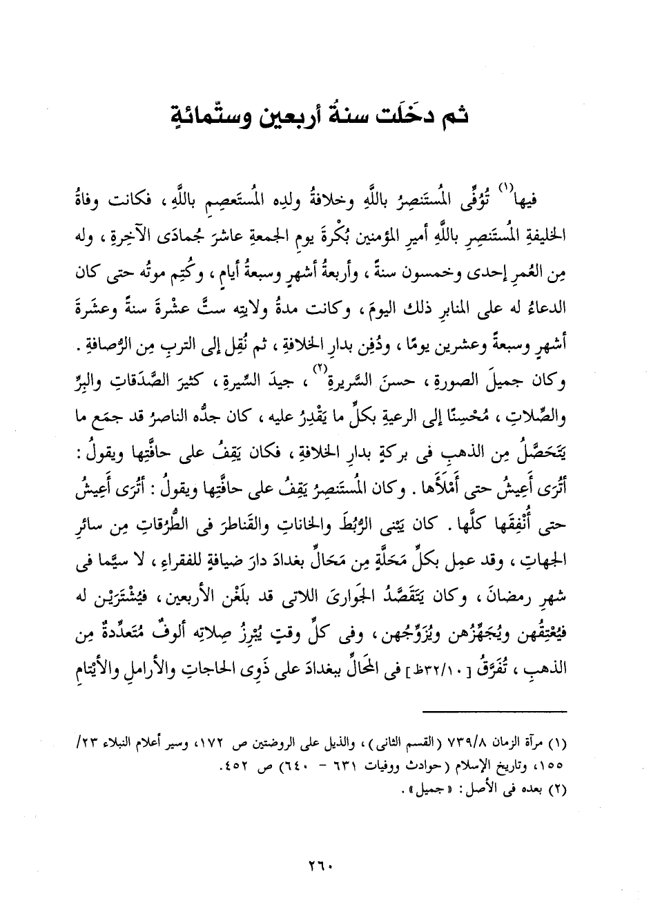 فِيهَا تُوُفِّيَ الْمُسْتَنْصِرُ بِاللَّهِ وَخَلَفَهُ وَلَدُهُ الْمُسْتَعْصِمُ بِاللَّهِ فَكَانَتْ وَفَاةُ الْخَلِيفَةِ الْمُسْتَنْصِرِ بِاللَّهِ أَمِيرِ الْمُؤْمِنِينَ بُكْرَةَ يَوْمِ الْجُمُعَةِ عَاشِرَ جُمَادَى الْآخِرَةِ، وَلَهُ مِنَ الْعُمْرِ إِحْدَى وَخَمْسُونَ سَنَةً، وَأَرْبَعَةُ أَشْهُرٍ وَسَبْعَةُ أَيَّامٍ، وَكُتِمَ مَوْتُهُ حَتَّى كَانَ الدُّعَاءُ لَهُ عَلَى الْمَنَابِرِ ذَلِكَ الْيَوْمَ. وَكَانَتْ مُدَّةُ وِلَايَتِهِ سِتَّ عَشْرَةَ سَنَةً وَعَشَرَةَ أَشْهُرٍ وَسَبْعَةً وَعِشْرِينَ يَوْمًا، وَدُفِنَ بِدَارِ الْخِلَافَةِ، ثُمَّ نُقِلَ إِلَى التُّرَبِ مِنَ الرُّصَافَةِ، وَكَانَ جَمِيلَ الصُّورَةِ، حَسَنَ السَّرِيرَةِ، جَيِّدَ السِّيرَةِ، كَثِيرَ الصَّدَقَاتِ وَالْبِرِّ وَالصِّلَاتِ، مُحْسِنًا إِلَى الرَّعِيَّةِ بِكُلِّ مَا يَقْدِرُ عَلَيْهِ، كَانَ جَدُّهُ النَّاصِرُ قَدْ جَمَعَ مَا يَتَحَصَّلُ مِنَ الذَّهَبِ فِي بِرْكَةٍ بِدَارِ الْخِلَافَةِ، فَكَانَ يَقِفُ عَلَى حَافَّتِهَا وَيَقُولُ: أَتُرَى أَعِيشُ حَتَّى أَمْلَأَهَا، وَكَانَ الْمُسْتَنْصِرُ يَقِفُ عَلَى حَافَّتِهَا وَيَقُولُ: أَتُرَى أَعِيشُ حَتَّى أُنْفِقَهَا كُلَّهَا. كَانَ يَبْنِي الرُّبُطَ وَالْخَانَاتِ وَالْقَنَاطِرَ فِي الطُّرُقَاتِ مِنْ سَائِرِ الْجِهَاتِ. وَقَدْ عَمِلَ بِكُلِّ مَحَلَّةٍ مِنْ مَحَالِّ بَغْدَادَ دَارَ ضِيَافَةٍ لِلْفُقَرَاءِ، لَاسِيَّمَا فِي شَهْرِ رَمَضَانَ، وَكَانَ يَتَقَصَّدُ الْجَوَارِيَ اللَّاتِي قَدْ بَلَغْنَ الْأَرْبَعِينَ، فَيُشْتَرَيْنَ لَهُ فَيُعْتِقُهُنَّ وَيُجَهِّزُهُنَّ وَيُزَوِّجُهُنَّ، وَفِي كُلِّ وَقْتٍ يُبْرِزُ صِلَاتِهِ أُلُوفٌ مُتَعَدِّدَةٌ مِنَ الذَّهَبِ، تُفَرَّقُ فِي الْمَحَالِّ بِبَغْدَادَ عَلَى ذَوِي الْحَاجَاتِ وَالْأَرَامِلِ وَالْأَيْتَامِ