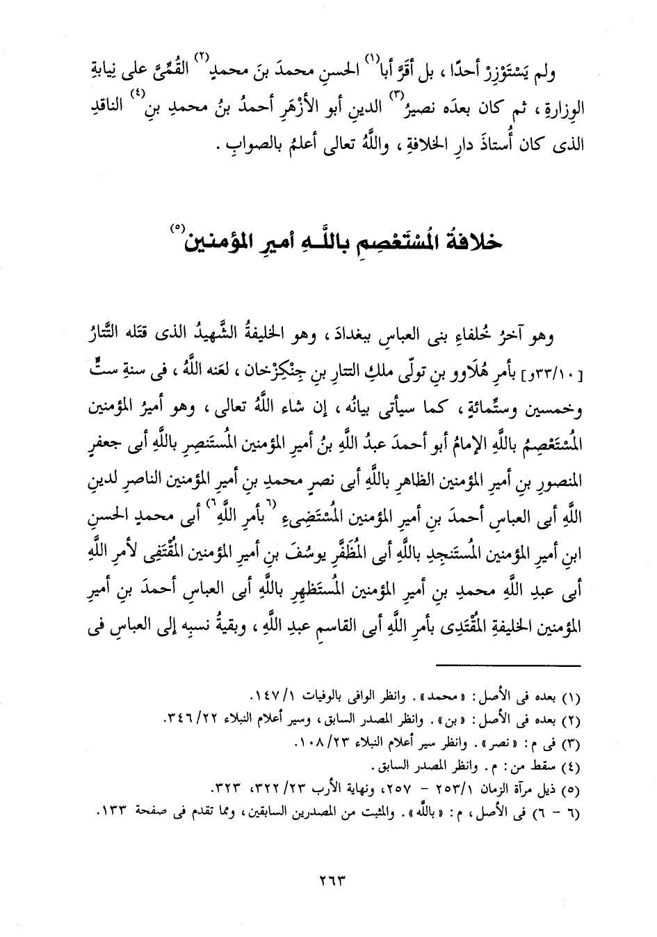 وَهُوَ آخِرُ خُلَفَاءِ بَنِي الْعَبَّاسِ بِبَغْدَادَ، وَهُوَ الْخَلِيفَةُ الشَّهِيدُ الَّذِي قَتَلَهُ التَّتَارُ، بِأَمْرِ هُلَاوُو بْنِ تُولُّيَّ مِلْكِ التَّتَارِ بْنِ جِنْكِزْخَانَ، لَعَنَهُ اللَّهُ، فِي سَنَةِ سِتٍّ وَخَمْسِينَ وَسِتِّمِائَةٍ، كَمَا سَيَأْتِي بَيَانُهُ، إِنْ شَاءَ اللَّهُ تَعَالَى، وَهُوَ أَمِيرُ الْمُؤْمِنِينَ الْمُسْتَعْصِمُ بِاللَّهِ الْإِمَامُ أَبُو أَحْمَدَ عَبْدُ اللَّهِ بْنُ أَمِيرِ الْمُؤْمِنِينَ الْمُسْتَنْصِرِ بِاللَّهِ أَبِي جَعْفَرٍ الْمَنْصُورِ بْنِ أَمِيرِ الْمُؤْمِنِينَ الظَّاهِرِ بِاللَّهِ أَبِي نَصْرٍ مُحَمَّدِ بْنِ أَمِيرِ الْمُؤْمِنِينَ النَّاصِرِ لِدِينِ اللَّهِ أَبِي الْعَبَّاسِ أَحْمَدَ بْنِ أَمِيرِ الْمُؤْمِنِينَ الْمُسْتَضِيءِ بِأَمْرِ اللَّهِ أَبِي مُحَمَّدٍ الْحَسَنِ بْنِ أَمِيرِ الْمُؤْمِنِينَ الْمُسْتَنْجِدِ بِاللَّهِ أَبِي الْمُظَفَّرِ يُوسُفَ بْنِ أَمِيرِ الْمُؤْمِنِينَ الْمُقْتَفِي لِأَمْرِ اللَّهِ أَبِي عَبْدِ اللَّهِ مُحَمَّدِ بْنِ أَمِيرِ الْمُؤْمِنِينَ الْمُسْتَظْهِرِ بِاللَّهِ أَبِي الْعَبَّاسِ أَحْمَدَ بْنِ أَمِيرِ الْمُؤْمِنِينَ الْخَلِيفَةِ الْمُقْتَدِي بِأَمْرِ اللَّهِ أَبِي الْقَاسِمِ عَبْدِ اللَّهِ، وَبَقِيَّةُ نَسَبِهِ إِلَى الْعَبَّاسِ فِي