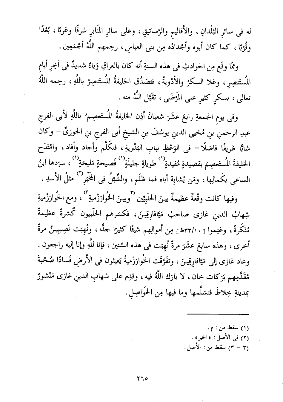 وَفِيهَا كَانَتْ وَقْعَةٌ عَظِيمَةٌ بَيْنَ الْحَلَبِيِّينَ وَبَيْنَ الْخُوَارَزْمِيَّةِ، وَمَعَ الْخُوَارَزْمِيَّةِ شِهَابُ الدِّينِ غَازِيٌّ صَاحِبُ مَيَّافَارِقِينَ، فَكَسَرَهُمُ الْحَلَبِيُّونَ كَسْرَةً عَظِيمَةً مُنْكَرَةً، وَغَنِمُوا مِنْ أَمْوَالِهِمْ شَيْئًا كَثِيرًا جِدًّا، وَنُهِبَتْ نَصِيبِينُ مَرَّةً أُخْرَى، وَهَذِهِ سَابِعَ عَشَرَ مَرَّةً نُهِبَتْ فِي هَذِهِ السِّنِينَ، فَإِنَّا لِلَّهِ وَإِنَّا إِلَيْهِ رَاجِعُونَ.