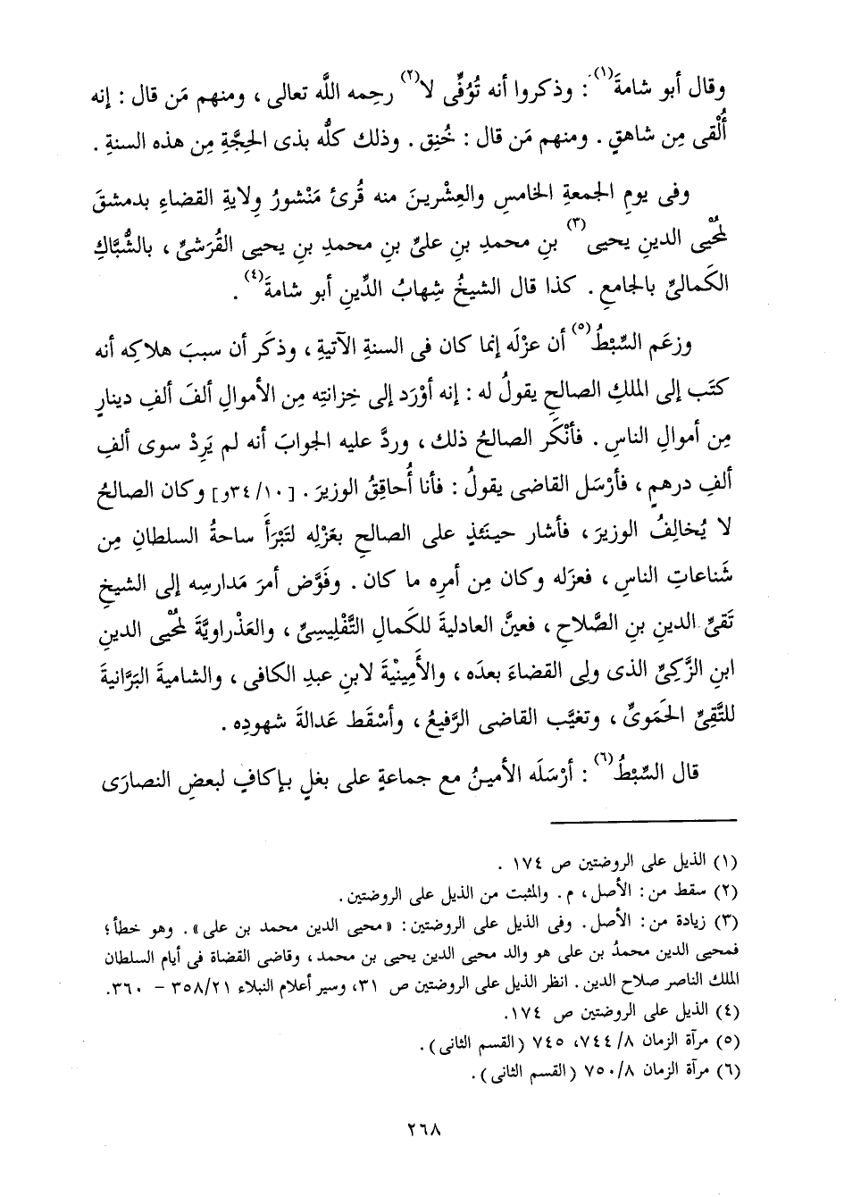 وَفِي يَوْمِ الْجُمُعَةِ الْخَامِسِ وَالْعِشْرِينَ مِنْهُ قُرِئَ مَنْشُورُ وِلَايَةِ الْقَضَاءِ بِدِمَشْقَ لِمُحْيِي الدِّينِ يَحْيَى بْنِ مُحَمَّدِ بْنِ عَلِيِّ بْنِ مُحَمَّدِ بْنِ يَحْيَى الْقُرَشِيِّ، بِالشُّبَّاكِ الْكَمَالِيِّ بِالْجَامِعِ. كَذَا قَالَ الشَّيْخُ شِهَابُ الدِّينِ أَبُو شَامَةَ.