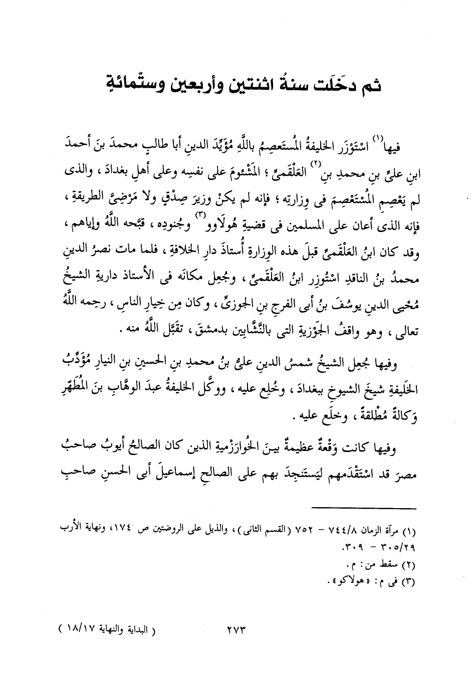 فِيهَا اسْتَوْزَرَ الْخَلِيفَةُ الْمُسْتَعْصِمُ بِاللَّهِ مُؤَيِّدَ الدِّينِ أَبَا طَالِبٍ مُحَمَّدَ بْنَ أَحْمَدَ بْنِ عَلِيِّ بْنِ مُحَمَّدِ بْنِ الْعَلْقَمِيِّ; الْمَشْئُومَ عَلَى نَفْسِهِ وَعَلَى أَهْلِ بَغْدَادَ، وَالَّذِي لَمْ يَعْصِمِ الْمُسْتَعْصِمَ فِي وِزَارَتِهِ; فَإِنَّهُ لَمْ يَكُنْ وَزِيرَ صِدْقٍ وَلَا مَرْضِيَّ الطَّرِيقَةِ، فَإِنَّهُ هُوَ الَّذِي أَعَانَ عَلَى الْمُسْلِمِينَ فِي قَضِيَّةِ هُولُاوُو وَجُنُودِهِ - قَبَّحَهُ اللَّهُ وَإِيَّاهُمْ - وَقَدْ كَانَ ابْنُ الْعَلْقَمِيِّ قَبْلَ هَذِهِ الْوِزَارَةِ أُسْتَاذَ دَارِ الْخِلَافَةِ، فَلَمَّا مَاتَ نَصْرُ الدِّينِ مُحَمَّدُ بْنُ النَّاقِدِ اسْتُوْزِرَ ابْنُ الْعَلْقَمِيِّ، وَجُعِلَ مَكَانَهُ فِي الْأُسْتَاذِ دَارِيَةِ الشَّيْخُ مُحْيِي الدِّينِ يُوسُفُ بْنُ أَبِي الْفَرَجِ بْنِ الْجَوْزِيِّ، وَكَانَ مِنْ خِيَارِ النَّاسِ، رَحِمَهُ اللَّهُ تَعَالَى، وَهُوَ وَاقِفُ الْجَوْزِيِّةِ الَّتِي بِالنَّشَّابِينَ بِدِمَشْقَ، تَقَبَّلَ اللَّهُ مِنْهُ.