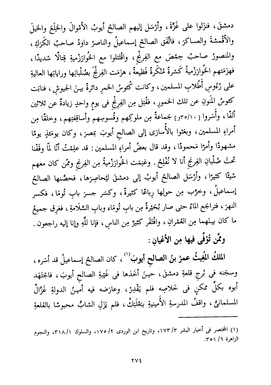 دِمَشْقَ، فَنَزَلُوا عَلَى غَزَّةَ، وَأَرْسَلَ إِلَيْهِمُ الصَّالِحُ أَيُّوبُ الْأَمْوَالَ وَالْخِلَعَ وَالْخَيْلَ وَالْأَقْمِشَةَ وَالْعَسَاكِرَ، فَاتَّفَقَ الصَّالِحُ إِسْمَاعِيلُ وَالنَّاصِرُ دَاوُدُ صَاحِبُ الْكَرَكِ، وَالْمَنْصُورُ صَاحِبُ حِمْصَ مَعَ الْفِرِنْجِ، وَاقْتَتَلُوا مَعَ الْخُوَارَزْمِيَّةِ قِتَالًا شَدِيدًا، فَهَزَمَتْهُمُ الْخُوَارَزْمِيَّةُ كَسْرَةً مُنْكَرَةً فَظِيعَةً، هَزَمَتِ الْفِرِنْجَ بِصُلْبَانِهَا وَرَايَاتِهَا الْعَالِيَةِ عَلَى رُءُوسِ أَطْلَابِ الْمُسْلِمِينَ، وَكَانَتْ كُئُوسُ الْخَمْرِ دَائِرَةً بَيْنَ الْجُيُوشِ، فَنَابَتْ كُئُوسُ الْمَنُونِ عَنْ تِلْكَ الْخُمُورِ، فَقُتِلَ مِنَ الْفِرِنْجِ فِي يَوْمٍ وَاحِدٍ زِيَادَةٌ عَنْ ثَلَاثِينَ أَلْفًا، وَأَسَرُوا جَمَاعَةً مِنْ مُلُوكِهِمْ وَقُسُوسِهِمْ وَأَسَاقِفَتِهِمْ، وَخَلْقًا مِنْ أُمَرَاءِ الْمُسْلِمِينَ، وَبَعَثُوا بِالْأُسَارَى إِلَى الصَّالِحِ أَيُّوبَ بِمِصْرَ، وَكَانَ يَوْمَئِذٍ يَوْمًا مَشْهُودًا وَأَمْرًا مَحْمُودًا. وَقَدْ قَالَ بَعْضُ أُمَرَاءِ الْمُسْلِمِينَ: قَدْ عَلِمْتُ أَنَّا لَمَّا وَقَفْنَا تَحْتَ صُلْبَانِ الْفِرِنْجِ أَنَّا لَا نُفْلِحُ. وَغَنِمَتِ الْخُوَارَزْمِيَّةُ مِنَ الْفِرِنْجِ، وَمِمَّنْ كَانَ مَعَهُمْ شَيْئًا كَثِيرًا، وَأَرْسَلَ الصَّالِحُ أَيُّوبُ إِلَى دِمَشْقَ لِيُحَاصِرَهَا، فَحَصَّنَهَا الصَّالِحُ إِسْمَاعِيلُ، وَخَرَّبَ مِنْ حَوْلِهَا رِبَاعًا كَثِيرَةً، وَكَسَرَ جِسْرَ بَابِ تُومَا، فَكَسَرَ النَّهْرَ فَتَرَاجَعَ الْمَاءُ حَتَّى صَارَ بُحَيْرَةً مِنْ بَابِ تُومَا وَبَابِ السَلَامَةِ، فَغَرِقَ جَمِيعُ مَا كَانَ بَيْنَهُمَا مِنَ الْعُمْرَانِ، وَافْتَقَرَ كَثِيرٌ مِنَ النَّاسِ، فَإِنَّا لِلَّهِ وَإِنَّا إِلَيْهِ رَاجِعُونَ.