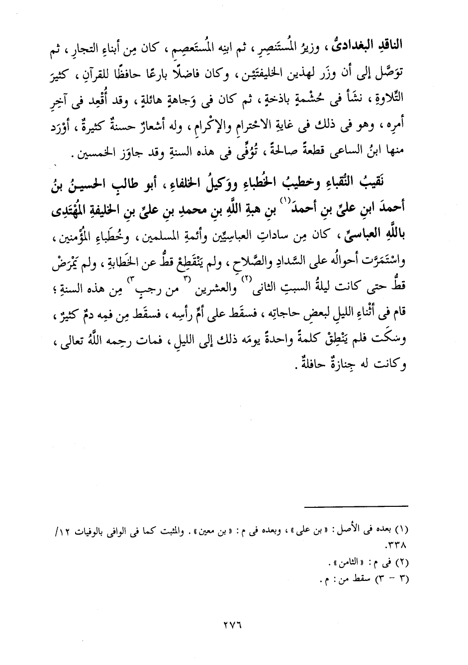 نَقِيبُ النُّقَبَاءِ وَخَطِيبُ الْخُطَبَاءِ وَكِيلُ الْخُلَفَاءِ، أَبُو طَالِبٍ الْحُسَيْنُ بْنُ أَحْمَدَ بْنِ عَلِيِّ بْنِ أَحْمَدَ بْنِ هِبَةِ اللَّهِ بْنِ مُحَمَّدِ بْنِ عَلِيِّ بْنِ الْخَلِيفَةِ الْمُهْتَدِي بِاللَّهِ الْعَبَّاسِيِّ. كَانَ مِنْ سَادَاتِ الْعَبَّاسِيِّينَ، وَأَئِمَّةِ الْمُسْلِمِينَ، وَخُطَبَاءِ الْمُؤْمِنِينَ، اسْتَمَرَّتْ أَحْوَالُهُ عَلَى السَّدَادِ وَالصَّلَاحِ، وَلَمْ يَنْقَطِعْ قَطُّ عَنِ الْخَطَابَةِ، وَلَمْ يَمْرَضْ قَطُّ حَتَّى كَانَتْ لَيْلَةُ السَّبْتِ الثَّانِي وَالْعِشْرِينَ مِنْ رَجَبٍ مِنْ هَذِهِ السَّنَةِ; قَامَ فِي أَثْنَاءِ اللَّيْلِ لِبَعْضِ حَاجَاتِهِ، فَسَقَطَ عَلَى أُمِّ رَأْسِهِ، فَسَقَطَ مِنْ فَمِهِ دَمٌ كَثِيرٌ، وَسَكَتَ فَلَمْ يَنْطِقْ كَلِمَةً وَاحِدَةً يَوْمَهُ ذَلِكَ إِلَى اللَّيْلِ، فَمَاتَ رَحِمَهُ اللَّهُ تَعَالَى، وَكَانَتْ لَهُ جَنَازَةٌ حَافِلَةٌ.