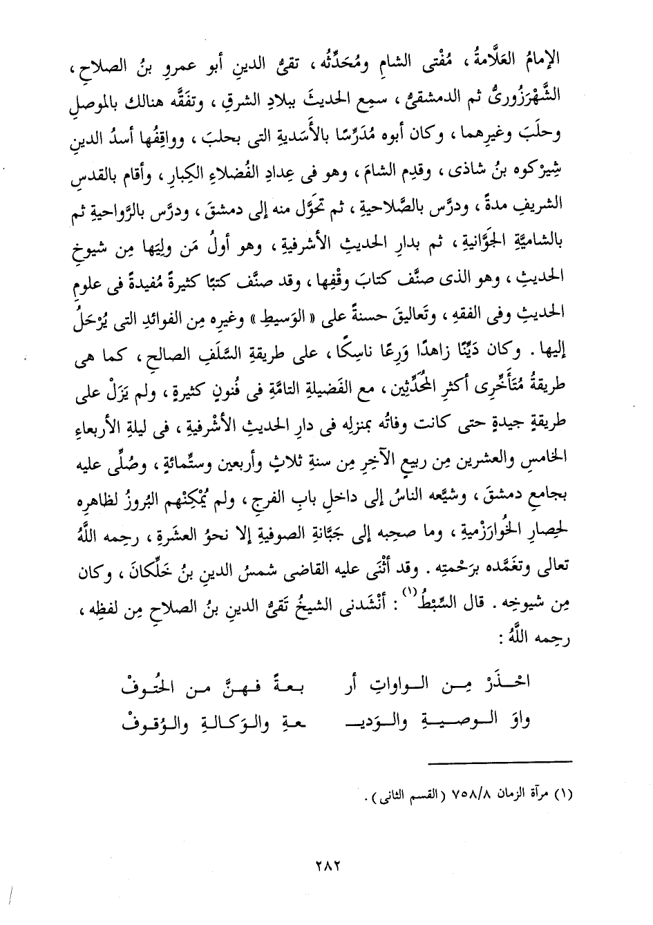 الْإِمَامُ الْعَلَّامَةُ، مُفْتِي الشَّامِ وَمُحَدِّثُهُ، تَقِيُّ الدِّينِ أَبُو عَمْرِو بْنُ الصَّلَاحِ، الشَّهْرَزُورِيُّ ثُمَّ الدِّمَشْقِيُّ، سَمِعَ الْحَدِيثَ بِبِلَادِ الشَّرْقِ، وَتَفَقَّهَ هُنَالِكَ بِالْمَوْصِلِ وَحَلَبَ وَغَيْرِهَا، وَكَانَ أَبُوهُ مُدَرِّسًا بِالْأَسَدِيَّةِ الَّتِي بِحَلَبَ، وَوَاقِفُهَا أَسَدُ الدِّينِ شِيرْكُوهْ بْنُ شَاذِيٍّ، وَقَدِمَ الشَّامَ، وَهُوَ فِي عِدَادِ الْفُضَلَاءِ الْكِبَارِ، وَأَقَامَ بِالْقُدْسِ مُدَّةً، وَدَرَّسَ بِالصَّلَاحِيَّةِ، ثُمَّ تَحَوَّلَ مِنْهُ إِلَى دِمَشْقَ، وَدَرَّسَ بِالرَّوَاحِيَّةِ ثُمَّ بِالشَّامِيَّةِ الْجَوَّانِيَّةِ، ثُمَّ بِدَارِ الْحَدِيثِ الْأَشْرَفِيَّةِ، وَهُوَ أَوَّلُ مَنْ وَلِيَهَا مِنْ شُيُوخِ الْحَدِيثِ، وَهُوَ الَّذِي صَنَّفَ كِتَابَ وَقْفِهَا، وَقَدْ صَنَّفَ كُتُبًا كَثِيرَةً مُفِيدَةً فِي عُلُومِ الْحَدِيثِ وَفِي الْفِقْهِ، وَتَعَالِيقَ حَسَنَةً عَلَى " الْوَسِيطِ " وَغَيْرِهِ مِنَ الْفَوَائِدِ الَّتِي يَرْحَلُ إِلَيْهَا. وَكَانَ دَيِّنًا زَاهِدًا وَرِعًا نَاسِكًا، عَلَى طَرِيقِ السَّلَفِ الصَّالِحِ، كَمَا هِيَ طَرِيقَةُ مُتَأَخِّرِي أَكْثَرِ الْمُحَدِّثِينَ، مَعَ الْفَضِيلَةِ التَّامَّةِ فِي فُنُونٍ كَثِيرَةٍ، وَلَمْ يَزَلْ عَلَى طَرِيقَةٍ جَيِّدَةٍ حَتَّى كَانَتْ وَفَاتُهُ بِمَنْزِلِهِ فِي دَارِ الْحَدِيثِ الْأَشْرَفِيَّةِ، فِي لَيْلَةِ الْأَرْبِعَاءِ الْخَامِسَ وَالْعِشْرِينَ مِنْ رَبِيعٍ الْآخِرِ مِنْ سَنَةِ ثَلَاثٍ وَأَرْبَعِينَ وَسِتِّمِائَةٍ، وَصُلِّيَ عَلَيْهِ بِجَامِعِ دِمَشْقَ، وَشَيَّعَهُ النَّاسُ إِلَى دَاخِلِ بَابِ الْفَرَجِ، وَلَمْ يُمْكِنْهُمُ الْبُرُوزُ لِظَاهِرِهِ لِحِصَارِ الْخُوَارَزْمِيَّةِ، وَمَا صَحِبَهُ إِلَى جَبَّانَةِ الصُّوفِيَّةِ إِلَّا نَحْوُ الْعَشَرَةِ، رَحِمَهُ اللَّهُ وَتَغَمَّدَهُ بِرَحْمَتِهِ، وَقَدْ أَثْنَى عَلَيْهِ الْقَاضِي شَمْسُ الدِّينِ بْنُ خَلِّكَانَ، وَكَانَ مِنْ شُيُوخِهِ. قَالَ السِّبْطُ: أَنْشَدَنِي الشَّيْخُ تَقِيُّ الدِّينِ مِنْ لَفْظِهِ، رَحِمَهُ اللَّهُ: