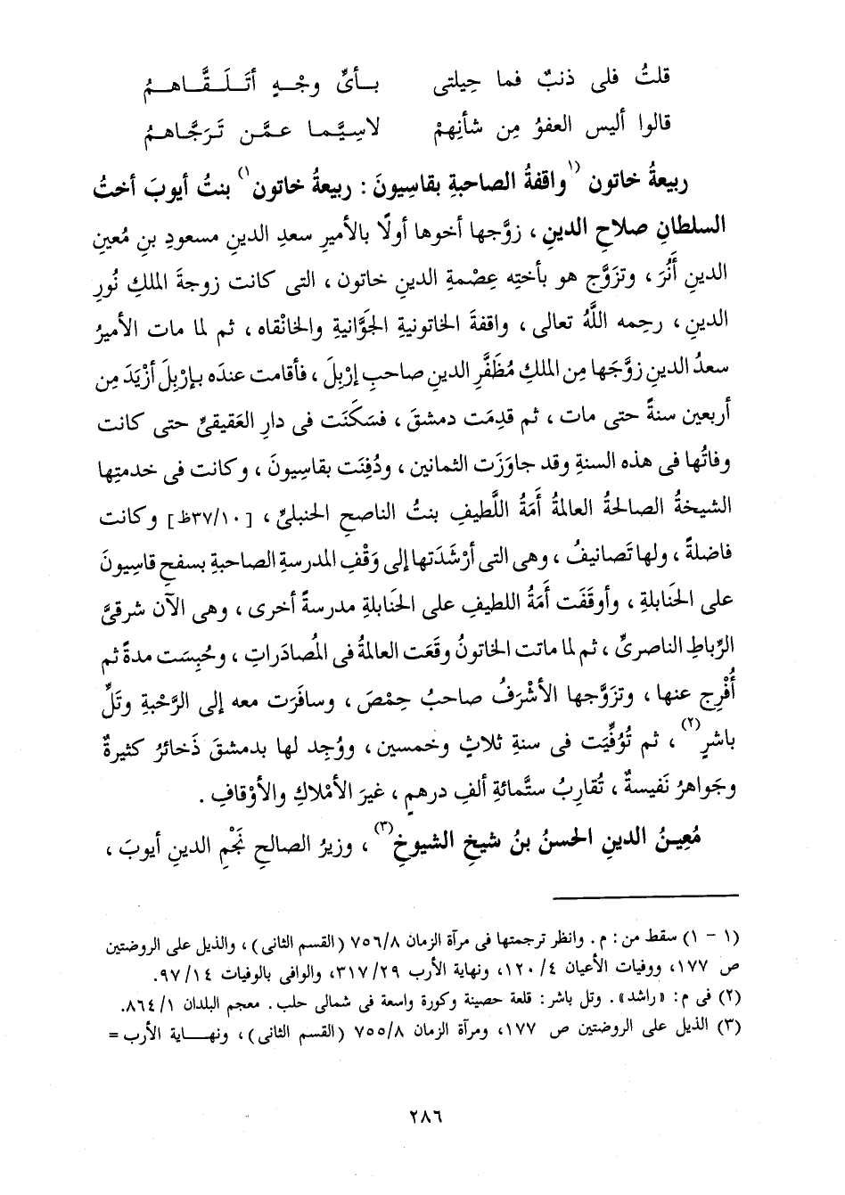 وَاقِفَةُ الصَّاحِبَةِ بِقَاسِيُونَ: رَبِيعَةُ خَاتُونَ بِنْتُ أَيُّوبَ أُخْتُ السُّلْطَانِ صَلَاحِ الدِّينِ، زَوَّجَهَا أَخُوهَا أَوَّلًا بِالْأَمِيرِ سَعْدِ الدِّينِ مَسْعُودِ بْنِ مُعِينِ الدِّينِ أَنُرَ، وَتَزَوَّجَ هُوَ بِأُخْتِهِ عِصْمَةَ الدِّينِ خَاتُونَ، الَّتِي كَانَتْ زَوْجَةَ الْمَلِكِ نُورِ الدِّينِ، وَاقِفَةَ الْخَاتُونِيَّةِ الْجَوَّانِيَّةِ وَالْخَانْقَاهْ، ثُمَّ لَمَّا مَاتَ الْأَمِيرُ سَعْدُ الدِّينِ زَوَّجَهَا مِنَ الْمَلِكِ مُظَفَّرِ الدِّينِ صَاحِبِ إِرْبِلَ، فَأَقَامَتْ عِنْدَهُ بِإِرْبِلَ أَزْيَدَ مِنْ أَرْبَعِينَ سَنَةً حَتَّى مَاتَ، ثُمَّ قَدِمَتْ دِمَشْقَ، فَسَكَنَتْ فِي دَارِ الْعَقِيقِيِّ حَتَّى كَانَتْ وَفَاتُهُا فِي هَذِهِ السَّنَةِ وَقَدْ جَاوَزَتِ الثَّمَانِينَ، وَدُفِنَتْ بِقَاسِيُونَ، وَكَانَتْ فِي خِدْمَتِهَا الشَّيْخَةُ الصَّالِحَةُ الْعَالِمَةُ أَمَةُ اللَّطِيفِ بِنْتُ النَّاصِحِ الْحَنْبَلِيِّ، وَكَانَتْ فَاضِلَةً، وَلَهَا تَصَانِيفُ، وَهِيَ الَّتِي أَرْشَدَتْهَا إِلَى وَقْفِ الْمَدْرَسَةِ الصَّاحِبَةِ بِسَفْحِ قَاسِيُونَ عَلَى الْحَنَابِلَةِ، وَأَوْقَفَتْ أَمَةُ اللَّطِيفِ عَلَى الْحَنَابِلَةِ مَدْرَسَةً أُخْرَى، وَهِيَ الْآنَ شَرْقِيَّ الرِّبَاطِ النَّاصِرِيِّ، ثُمَّ لَمَّا مَاتَتِ الْخَاتُونُ وَقَعَتِ الْعَالِمَةُ فِي الْمُصَادَرَاتِ، وَحُبِسَتْ مُدَّةً ثُمَّ أُفْرِجَ عَنْهَا، وَتَزَوَّجَهَا الْأَشْرَفُ صَاحِبُ حِمْصَ، وَسَافَرَتْ مَعَهُ إِلَى الرَّحْبَةِ، وَتَلِّ بَاشِرٍ، ثُمَّ تُوُفِّيَتْ فِي سَنَةِ ثَلَاثٍ وَخَمْسِينَ، وَوُجِدَ لَهَا بِدِمَشْقَ ذَخَائِرُ كَثِيرَةٌ وَجَوَاهِرُ ثَمِينَةٌ، تُقَارِبُ سِتَّمِائَةِ أَلْفِ دِرْهَمٍ، غَيْرَ الْأَمْلَاكِ وَالْأَوْقَافِ.