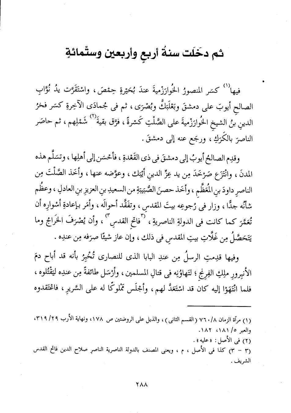 فِيهَا كَسَرَ الْمَنْصُورُ الْخُوَارَزْمِيَّةَ عِنْدَ بُحَيْرَةِ حِمْصَ، وَاسْتَقَرَّتْ يَدُ نُوَّابِ الصَّالِحِ أَيُّوبَ عَلَى دِمَشْقَ وَبَعْلَبَكَّ وَبُصْرَى، ثُمَّ فِي جُمَادَى الْآخِرَةِ كَسَرَ فَخْرُ الدِّينِ بْنُ الشَّيْخِ الْخُوَارَزْمِيَّةَ عَلَى الصَّلْتِ كَسْرَةً، فَرَّقَ بَقِيَّةَ شَمْلِهِمْ، ثُمَّ حَاصَرَ النَّاصِرَ بِالْكَرَكِ، وَرَجَعَ عَنْهُ إِلَى دِمَشْقَ.