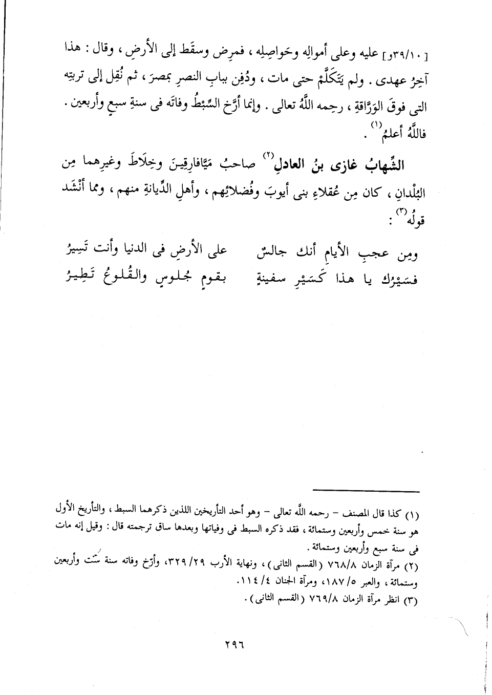 الشِّهَابُ غَازِيُّ بْنُ الْعَادِلِ صَاحِبُ مَيَّافَارِقِينَ وَخِلَاطَ وَغَيْرِهِمَا مِنَ الْبُلْدَانِ، كَانَ مِنْ عُقَلَاءِ بَنِي أَيُّوبَ، وَفُضَلَائِهِمْ وَأَهْلِ الدِّيَانَةِ مِنْهُمْ، وَمِمَّا أَنْشَدَ قَوْلُهُ: