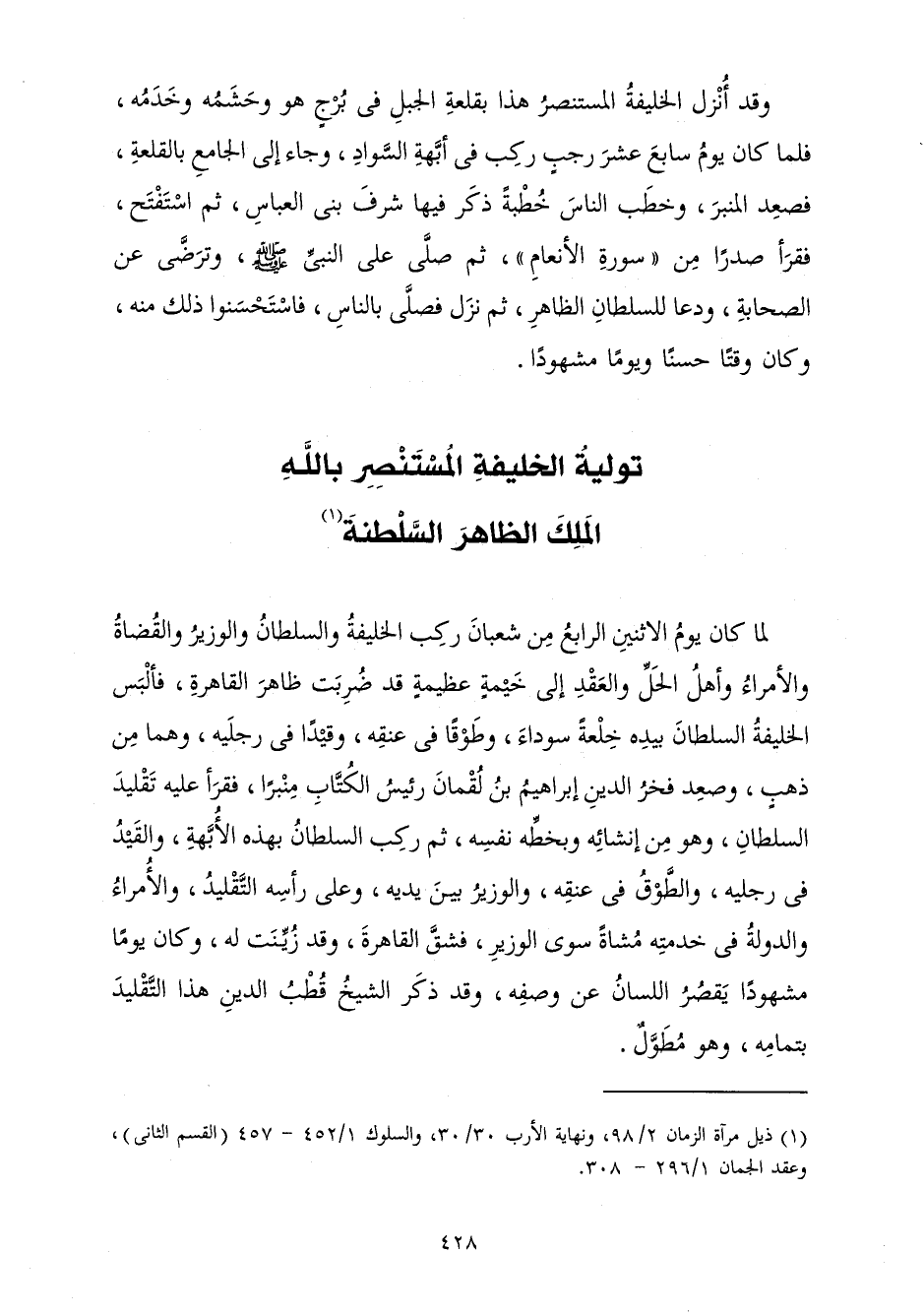 لَمَّا كَانَ يَوْمُ الِاثْنَيْنِ الرَّابِعِ مِنْ شَعْبَانَ رَكِبَ الْخَلِيفَةُ وَالسُّلْطَانُ وَالْوَزِيرُ وَالْقُضَاةُ وَالْأُمَرَاءُ وَأَهْلُ الْحَلِّ وَالْعَقْدِ إِلَى خَيْمَةٍ عَظِيمَةٍ قَدْ ضُرِبَتْ ظَاهِرَ الْقَاهِرَةِ، فَأَلْبَسَ الْخَلِيفَةُ السُّلْطَانَ بِيَدِهِ خِلْعَةً سَوْدَاءَ، وَطَوْقًا فِي عُنُقِهِ، وَقَيْدًا فِي رِجْلَيْهِ، وَهُمَا مِنْ ذَهَبٍ، وَصَعِدَ فَخْرُ الدِّينِ إِبْرَاهِيمُ بْنُ لُقْمَانَ رَئِيسُ الْكُتَّابِ مِنْبَرًا، فَقَرَأَ عَلَيْهِ تَقْلِيدَ السُّلْطَانِ، وَهُوَ مِنْ إِنْشَائِهِ وَبِخَطِّهِ نَفْسِهِ، ثُمَّ رَكِبَ السُّلْطَانُ بِهَذِهِ الْأُبَّهَةِ، وَالْقَيْدُ فِي رِجْلَيْهِ، وَالطَّوْقُ فِي عُنُقِهِ، وَالْوَزِيرُ بَيْنَ يَدَيْهِ، وَعَلَى رَأْسِهِ التَّقْلِيدُ، وَالْأُمَرَاءُ وَالدَّوْلَةُ فِي خِدْمَتِهِ مُشَاةٌ سِوَى الْوَزِيرِ، فَشَقَّ الْقَاهِرَةَ، وَقَدْ زُيِّنَتْ لَهُ، وَكَانَ يَوْمًا مَشْهُودًا يَقْصُرُ اللِّسَانُ عَنْ وَصْفِهِ، وَقَدْ ذَكَرَ الشَّيْخُ قُطْبُ الدِّينِ هَذَا التَّقْلِيدَ بِتَمَامِهِ، وَهُوَ مُطَوَّلٌ.
