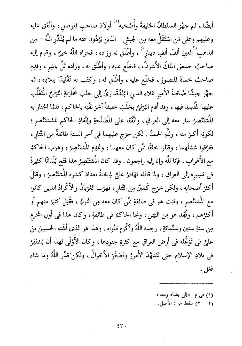 أَيْضًا ثُمَّ جَهَّزَ السُّلْطَانُ الْخَلِيفَةَ وَأَصْحَبَهُ أَوْلَادَ صَاحِبِ الْمَوْصِلِ، وَأَنْفَقَ عَلَيْهِ وَعَلَيْهِمْ، وَعَلَى مَنِ اسْتَقَلَّ مَعَهُ مِنَ الْجَيْشِ - الَّذِينَ يَرُدُّونَ عَنْهُ مَا لَمْ يُقَدِّرِ اللَّهُ - مِنَ الذَّهَبِ الْعَيْنِ أَلْفَ أَلْفِ دِينَارٍ، وَأَطْلَقَ لَهُ وَزَادَهُ، فَجَزَاهُ اللَّهُ خَيْرًا، وَقَدِمَ إِلَيْهِ صَاحِبُ حِمْصَ الْمَلِكُ الْأَشْرَفُ، فَخَلَعَ عَلَيْهِ، وَأَطْلَقَ لَهُ، وَزَادَهُ تَلَّ بَاشِرٍ، وَقَدِمَ صَاحِبُ حَمَاةَ الْمَنْصُورُ، فَخَلَعَ عَلَيْهِ، وَأَطْلَقَ لَهُ وَكَتَبَ لَهُ تَقْلِيدًا بِبِلَادِهِ، ثُمَّ جَهَّزَ جَيْشًا صُحْبَةَ الْأَمِيرِ عَلَاءِ الدِّينِ الْبُنْدُقْدَارِيِّ إِلَى حَلَبَ لِمُحَارَبَةِ الْبُرْلِيِّ الْمُتَغَلِّبِ عَلَيْهَا الْمُفْسِدِ فِيهَا، وَقَدْ أَقَامَ الْبُرْلِيُّ بِحَلَبَ خَلِيفَةً آخَرَ لَقَّبَهُ بِالْحَاكِمِ، فَلَمَّا اجْتَازَ بِهِ الْمُسْتَنْصِرُ سَارَ مَعَهُ إِلَى الْعِرَاقِ، وَاتَّفَقَا عَلَى الْمَصْلَحَةِ وَإِنْفَاذِ الْحَاكِمِ لِلْمُسْتَنْصِرِ; لِكَوْنِهِ أَكْبَرَ مِنْهُ وَلِلَّهِ الْحَمْدُ.