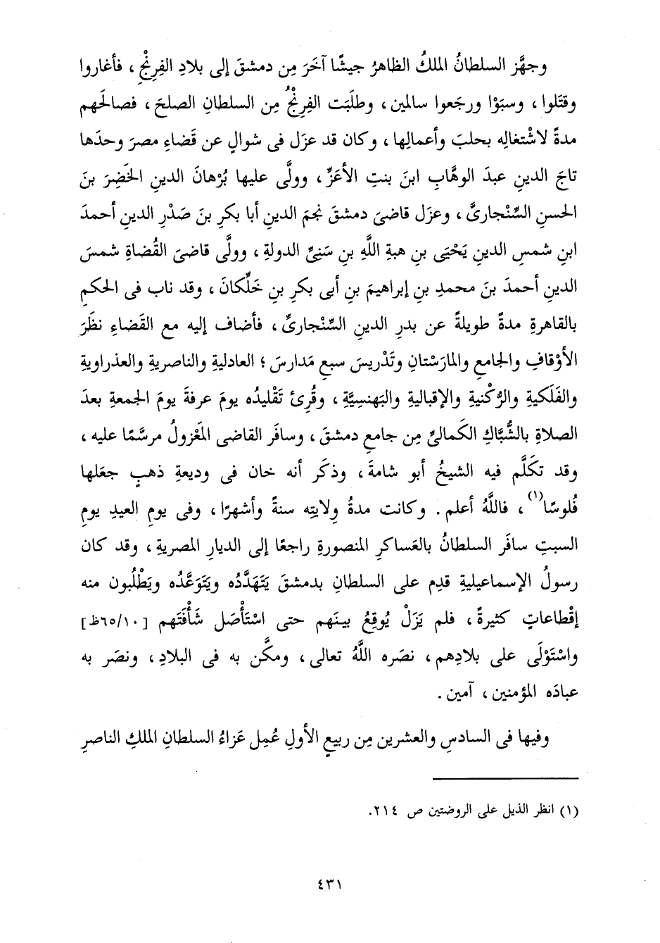 وَكَانَتْ مُدَّةُ وِلَايَتِهِ سَنَةً وَأَشْهُرًا، وَفِي يَوْمِ الْعِيدِ يَوْمَ السَّبْتِ سَافَرَ السُّلْطَانُ بِالْعَسَاكِرِ الْمَنْصُورَةِ رَاجِعًا إِلَى الدِّيَارِ الْمِصْرِيَّةِ، وَقَدْ كَانَ رَسُولُ الْإِسْمَاعِيلِيَّةِ قَدِمَ عَلَى السُّلْطَانِ بِدِمَشْقَ يَتَهَدَّدُهُ وَيَتَوَعَّدُهُ وَيَطْلُبُونَ مِنْهُ إِقْطَاعَاتٍ كَثِيرَةً، فَلَمْ يَزَلْ يُوقِعُ بَيْنَهُمْ حَتَّى اسْتَأْصَلَ شَأْفَتَهُمْ وَاسْتَوْلَى عَلَى بِلَادِهِمْ، نَصَرَهُ اللَّهُ تَعَالَى، وَمَكَّنَ بِهِ الْبِلَادَ وَنَصَرَ بِهِ عِبَادَهُ الْمُؤْمِنِينَ، آمِينَ.