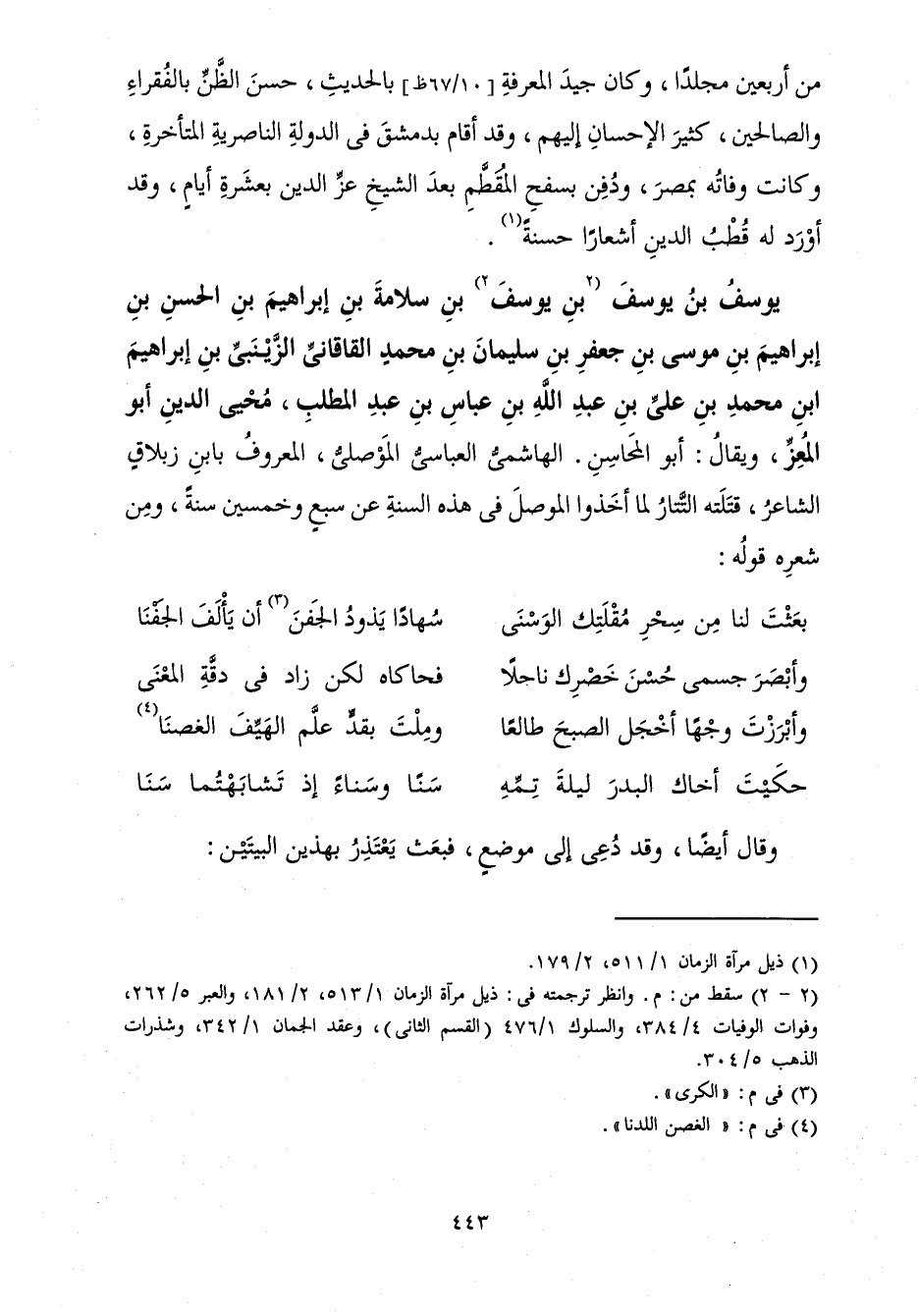 بْنِ إِبْرَاهِيمَ بْنِ الْحَسَنِ بْنِ إِبْرَاهِيمَ بْنِ مُوسَى بْنِ جَعْفَرِ بْنِ سُلَيْمَانَ بْنِ مُحَمَّدٍ الْقَاقَانِيِّ الزَّيْنَبِيِّ بْنِ إِبْرَاهِيمَ بْنِ مُحَمَّدِ بْنِ عَلِيِّ بْنِ عَبْدِ اللَّهِ بْنِ عَبَّاسِ بْنِ عَبَدِ الْمُطَّلِبِ، مُحْيِي الدِّينِ أَبُو الْمُعِزِّ، وَيُقَالُ: أَبُو الْمَحَاسِنِ الْهَاشِمِيُّ الْعَبَّاسِيُّ الْمُوَصِّلِيُّ، الْمَعْرُوفُ بِابْنِ زَبْلَاقٍ الشَّاعِرُ، قَتَلَتْهُ التَّتَارُ لَمَّا أَخَذُوا الْمَوْصِلَ فِي هَذِهِ السَّنَةِ عَنْ سَبْعٍ وَخَمْسِينَ سَنَةً، وَمِنْ شِعْرِهِ قَوْلُهُ:
