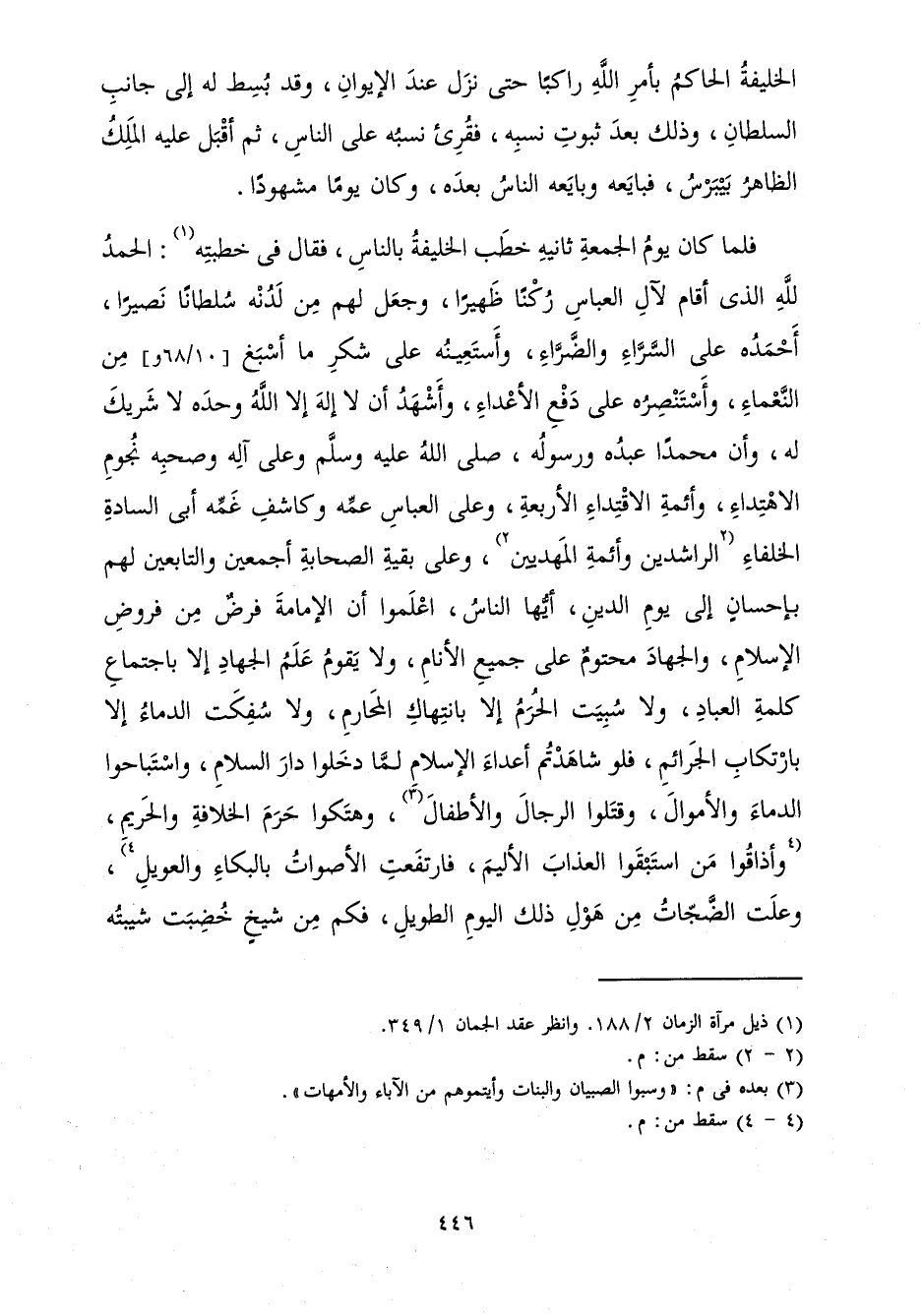 فَلَمَّا كَانَ يَوْمُ الْجُمُعَةِ ثَانِيهِ خَطَبَ الْخَلِيفَةُ بِالنَّاسِ، فَقَالَ فِي خُطْبَتِهِ: الْحَمْدُ لِلَّهِ الَّذِي أَقَامَ لِآلِ الْعَبَّاسِ رُكْنًا ظَهِيرًا، وَجَعَلَ لَهُمْ مِنْ لَدُنْهُ سُلْطَانًا نَصِيرًا، أَحْمَدُهُ عَلَى السَّرَّاءِ وَالضَّرَّاءِ، وَأَسْتَعِينُهُ عَلَى شُكْرِ مَا أَسْبَغَ مِنَ النَّعْمَاءِ، وَأَسْتَنْصِرُهُ عَلَى دَفْعِ الْأَعْدَاءِ، وَأَشْهَدُ أَنَّ لَا إِلَهَ إِلَّا اللَّهُ وَحْدَهُ لَا شَرِيكَ لَهُ، وَأَنَّ مُحَمَّدًا عَبْدُهُ وَرَسُولُهُ، صَلَّى اللَّهُ عَلَيْهِ وَسَلَّمَ وَعَلَى آلِهِ وَصَحْبِهِ نُجُومِ الِاهْتِدَاءِ، وَأَئِمَّةِ الِاقْتِدَاءِ الْأَرْبَعَةِ، وَعَلَى الْعَبَّاسِ عَمِّهِ وَكَاشِفِ غَمِّهِ أَبِي السَّادَةِ الْخُلَفَاءِ الرَّاشِدِينَ وَأَئِمَّةِ الْمَهْدِيِّينَ، وَعَلَى بَقِيَّةِ الصَّحَابَةِ أَجْمَعِينَ وَالتَّابِعَيْنَ لَهُمْ بِإِحْسَانٍ إِلَى يَوْمِ الدِّينِ. أَيُّهَا النَّاسُ اعْلَمُوا أَنَّ الْإِمَامَةَ فَرْضٌ مِنْ فُرُوضِ الْإِسْلَامِ، وَالْجِهَادُ مَحْتُومٌ عَلَى جَمِيعِ الْأَنَامِ، وَلَا يَقُومُ عَلَمُ الْجِهَادِ إِلَّا بِاجْتِمَاعِ كَلِمَةِ الْعِبَادِ، وَلَا سُبِيَتِ الْحُرَمُ إِلَّا بِانْتِهَاكِ الْمَحَارِمِ، وَلَا سُفِكَتِ الدِّمَاءُ إِلَّا بِارْتِكَابِ الْجَرَائِمِ، فَلَوْ شَاهَدْتُمْ أَعْدَاءَ الْإِسْلَامِ لَمَّا دَخَلُوا دَارَ السَّلَامِ، وَاسْتَبَاحُوا الدِّمَاءَ وَالْأَمْوَالَ، وَقَتَلُوا الرِّجَالَ وَالْأَطْفَالَ، وَهَتَكُوا حُرَمَ الْخِلَافَةِ وَالْحَرِيمِ، وَأَذَاقُوا مَنِ اسْتَبَقُوا الْعَذَابَ الْأَلِيمَ، فَارْتَفَعَتِ الْأَصْوَاتُ بِالْبُكَاءِ وَالْعَوِيلِ، وَعَلَتِ الضَّجَّاتُ مِنْ هَوْلِ ذَلِكَ الْيَوْمِ الطَّوِيلِ، فَكَمْ مِنْ شَيْخٍ خُضِّبَتْ شَيْبَتُهُ