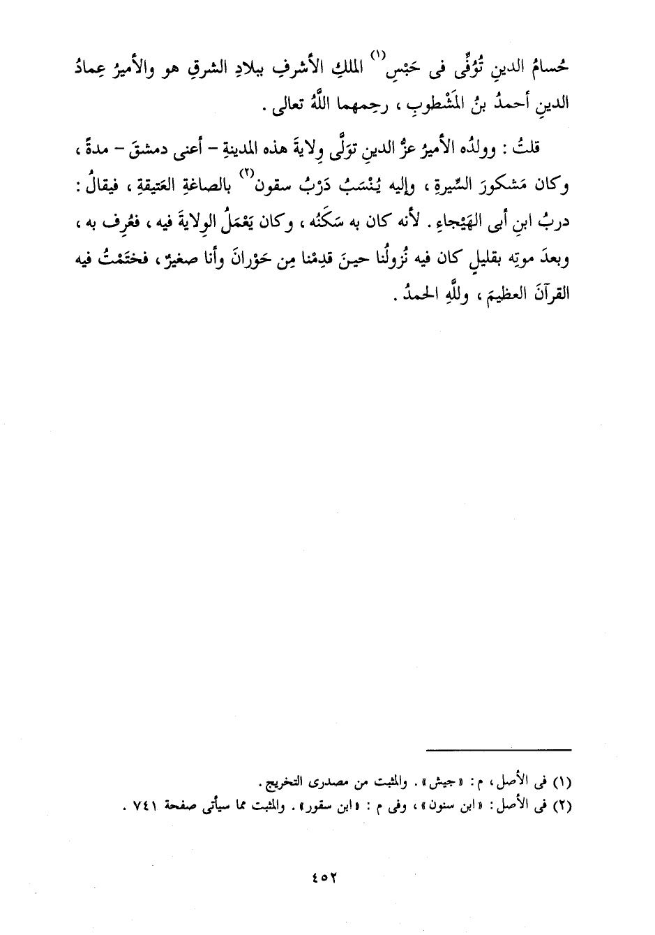 قُلْتُ: وَوَلَدُهُ الْأَمِيرُ عِزُّ الدِّينِ تَوَلَّى وِلَايَةَ هَذِهِ الْمَدِينَةِ - أَعْنِي دِمَشْقَ - مُدَّةً، وَكَانَ مَشْكُورَ السِّيرَةِ، وَإِلَيْهِ يُنْسَبُ دَرْبُ سَقَونَ بِالصَّاغَةِ الْعَتِيقَةِ، فَيُقَالُ: دَرْبُ ابْنِ أَبِي الْهَيْجَاءِ. لِأَنَّهُ كَانَ بِهِ سَكَنُهُ، وَكَانَ يَعْمَلُ الْوِلَايَةَ فِيهِ، فَعُرِفَ بِهِ، وَبَعْدَ مَوْتِهِ بِقَلِيلٍ كَانَ فِيهِ نُزُولُنَا حِينَ قَدِمْنَا مِنْ حُورَانَ وَأَنَا صَغِيرٌ، فَخَتَمْتُ فِيهِ الْقُرْآنَ الْعَظِيمَ، وَلِلَّهِ الْحَمْدُ.