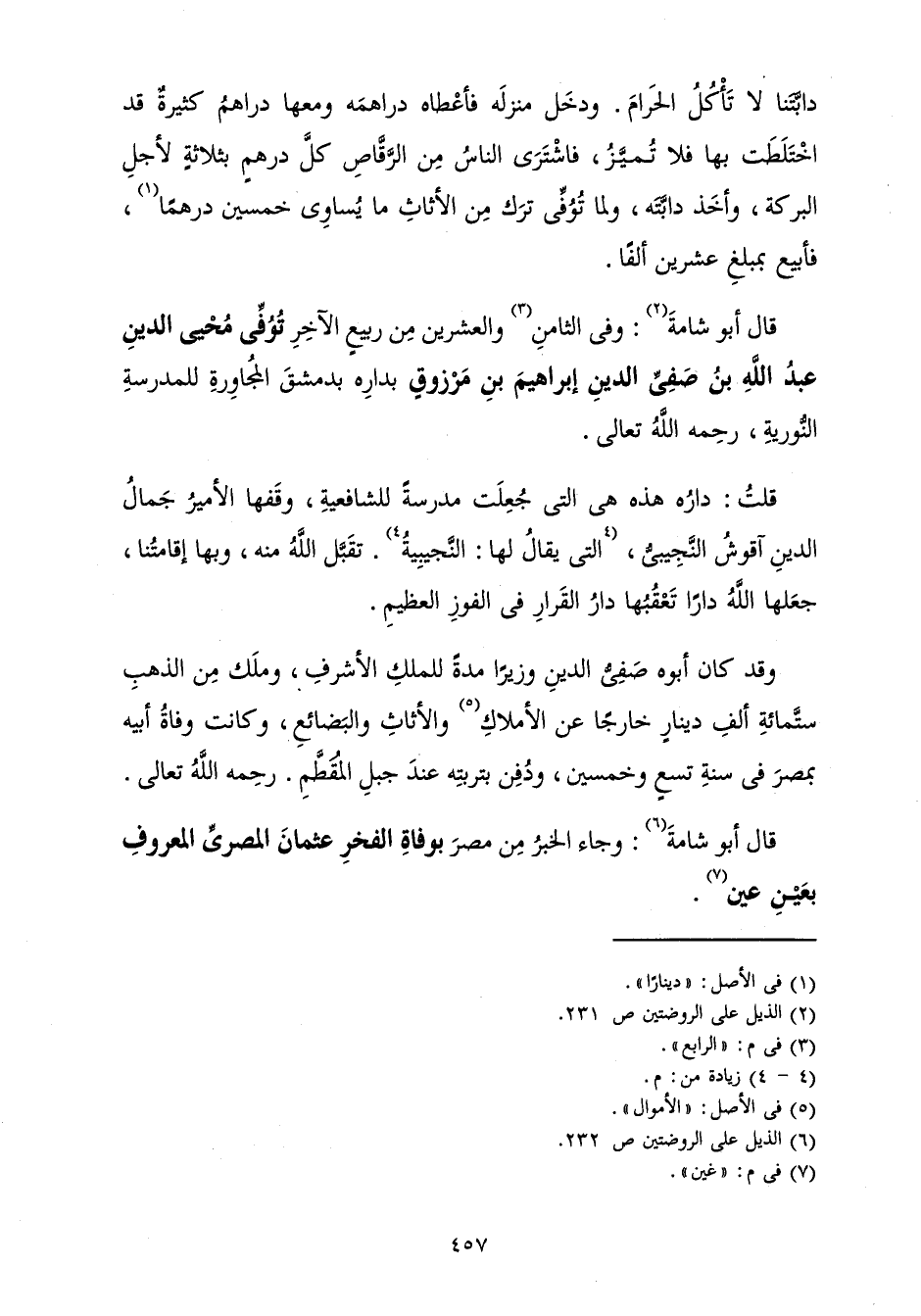 قَالَ أَبُو شَامَةَ: وَفِي الثَّامِنِ وَالْعِشْرِينَ مِنْ رَبِيعٍ الْآخِرِ تُوُفِّيَ مُحْيِي الدِّينِ عَبْدُ اللَّهِ بْنُ صَفِيِّ الدِّينِ إِبْرَاهِيمَ بْنِ مَرْزُوقٍ بِدَارِهِ بِدِمَشْقَ الْمُجَاوِرَةِ لِلْمَدْرَسَةِ النُّورِيَّةِ، رَحِمَهُ اللَّهُ تَعَالَى.