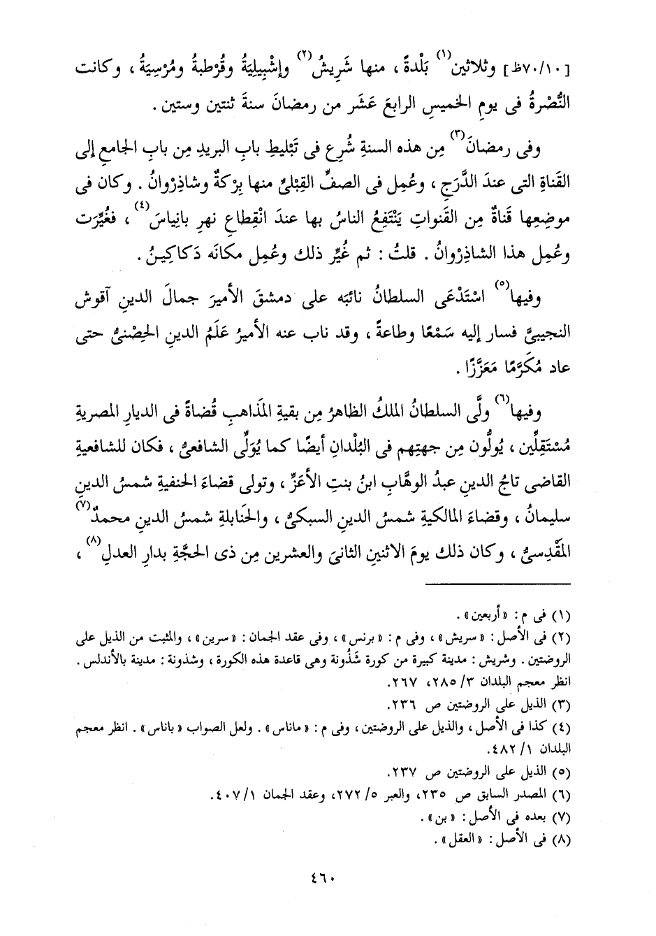 وَفِي رَمَضَانَ مِنْ هَذِهِ السَّنَةِ شُرِعَ فِي تَبْلِيطِ بَابِ الْبَرِيدِ مِنْ بَابِ الْجَامِعِ إِلَى الْقَنَاةِ الَّتِي عِنْدَ الدَّرَجِ، وَعَمِلَ فِي الصَّفِّ الْقِبْلِيِّ مِنْهَا بَرَكَةُ وَشَاذِرْوَانُ. وَكَانَ فِي مَوْضِعِهَا قَنَاةٌ مِنَ الْقَنَوَاتِ يَنْتَفِعُ النَّاسُ بِهَا عِنْدَ انْقِطَاعِ نَهْرِ بَانِيَاسَ، فَغُيِّرَتْ وَعُمِلَ هَذَا الشَّاذِرْوَانُ. قُلْتُ: ثُمَّ غُيِّرَ ذَلِكَ وَعُمِلَ مَكَانَهُ دَكَاكِينُ.