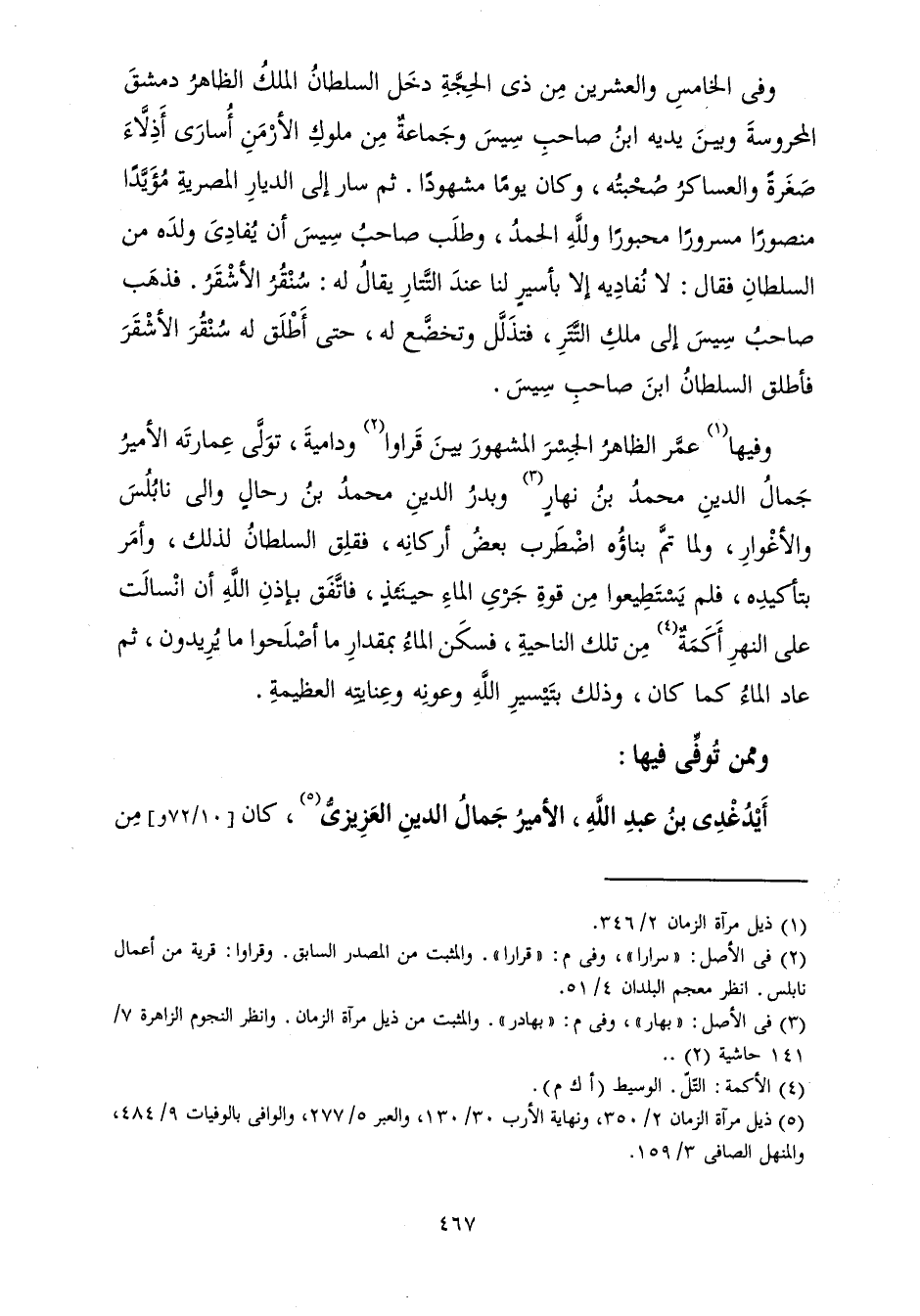 وَفِي الْخَامِسِ وَالْعِشْرِينَ مِنْ ذِي الْحِجَّةِ دَخَلَ السُّلْطَانُ الْمَلِكُ الظَّاهِرُ دِمَشْقَ الْمَحْرُوسَةَ وَبَيْنَ يَدَيْهِ ابْنُ صَاحِبِ سِيسَ وَجَمَاعَةٌ مِنْ مُلُوكِ الْأَرْمَنِ أُسَارَى أَذِلَّاءَ صَغَرَةً وَالْعَسَاكِرُ صُحْبَتُهُ، وَكَانَ يَوْمًا مَشْهُودًا. ثُمَّ سَارَ إِلَى الدِّيَارِ الْمِصْرِيَّةِ مُؤَيَّدًا مَنْصُورًا مَسْرُورًا مَحْبُورًا وَلِلَّهِ الْحَمْدُ، وَطَلَبَ صَاحِبُ سِيسَ أَنْ يُفَادِيَ وَلَدَهُ مِنَ السُّلْطَانِ فَقَالَ: لَا نُفَادِيهِ إِلَّا بِأَسِيرٍ لَنَا عِنْدَ التَّتَارِ يُقَالُ لَهُ: سُنْقُرَ الْأَشْقَرَ. فَذَهَبً صَاحِبُ سِيسَ إِلَى مَلِكِ التَّتَرِ، فَتَذَلَّلَ وَتَخَضَّعَ لَهُ، حَتَّى أَطْلَقَ لَهُ سُنْقُرَ الْأَشْقَرَ فَأَطْلَقَ السُّلْطَانُ ابْنَ صَاحِبِ سِيسَ.