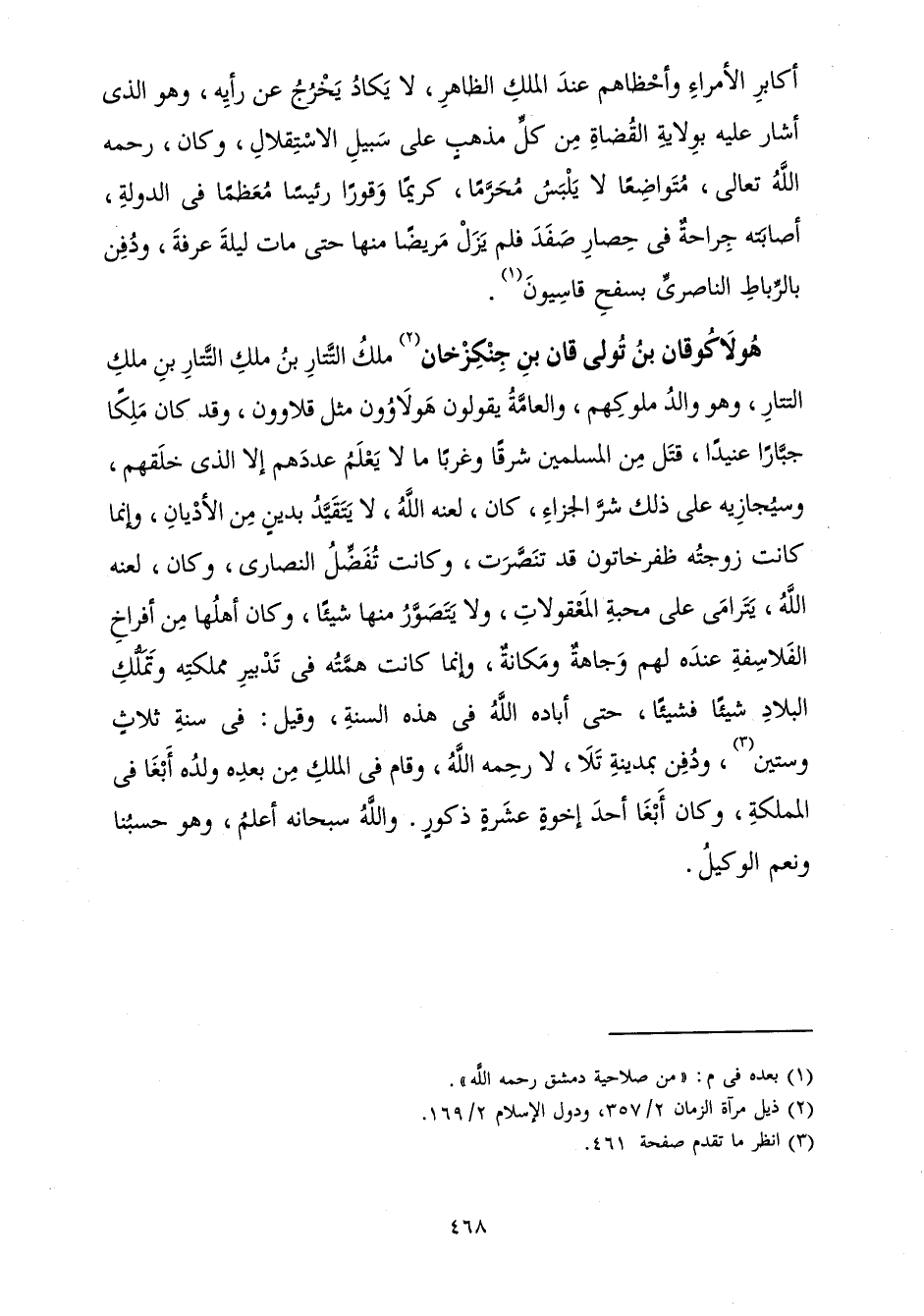 مَلِكُ التَّتَارِ بْنِ مَلَكِ التَّتَارِ بْنِ مَلَكِ التَّتَارِ، وَهُوَ وَالِدُ مُلُوكِهِمْ، وَالْعَامَّةُ يَقُولُونَ هُولَاوُونَ مِثْلَ قَلَاوُونَ، وَقَدْ كَانَ مَلِكًا جَبَّارًا عَنِيدًا، قَتَلَ مِنَ الْمُسْلِمِينَ شَرْقًا وَغَرْبًا مَالَا يَعْلَمُ عَدَدَهُمْ إِلَّا الَّذِي خَلَقَهُمْ، وَسَيُجَازِيهِ عَلَى ذَلِكَ شَرَّ الْجَزَاءِ، كَانَ لَعَنَهُ اللَّهُ، لَا يَتَقَيَّدُ بِدِينٍ مِنَ الْأَدْيَانِ، وَإِنَّمَا كَانَتْ زَوْجَتُهُ ظُفْرُ خَاتُونَ قَدْ تَنَصَّرَتْ، وَكَانَتْ تُفَضِّلُ النَّصَارَى، وَكَانَ - لَعَنَهُ اللَّهُ - يَتَرَامَى عَلَى مَحَبَّةِ الْمَعْقُولَاتِ، وَلَا يَتَصَوَّرُ مِنْهَا شَيْئًا، وَكَانَ أَهْلُهَا مِنْ أَفْرَاخِ الْفَلَاسِفَةِ عِنْدَهُ لَهُمْ وَجَاهَةٌ وَمَكَانَةٌ، وَإِنَّمَا كَانَتْ هِمَّتُهُ فِي تَدْبِيرِ مَمْلَكَتِهِ وَتَمَلُّكِ الْبِلَادِ شَيْئًا فَشَيْئًا، حَتَّى أَبَادَهُ اللَّهُ فِي هَذِهِ السَّنَةِ، وَقِيلَ: فِي سَنَةِ ثَلَاثٍ وَسِتِّينَ، وَدُفِنَ فِي مَدِينَةِ تَلَا، لَا رَحِمَهُ اللَّهُ، وَقَامَ فِي الْمُلِكِ مِنْ بَعْدِهِ وَلَدُهُ أَبْغَا فِي الْمَمْلَكَةِ، وَكَانَ أَبْغَا أَحَدَ إِخْوَةٍ عَشَرَةٍ ذُكُورٍ. وَاللَّهُ سُبْحَانَهُ أَعْلَمُ، وَهُوَ حَسَبُنَا وَنِعْمَ الْوَكِيلُ.