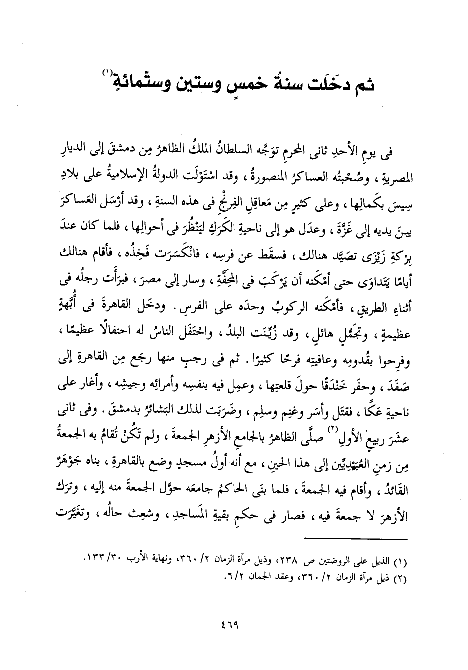 فِي يَوْمِ الْأَحَدِ ثَانِي الْمُحَرَّمِ تَوَجَّهَ السُّلْطَانُ الْمَلِكُ الظَّاهِرُ مِنْ دِمَشْقَ إِلَى الدِّيَارِ الْمِصْرِيَّةِ، وَصَحِبَتْهُ الْعَسَاكِرُ الْمَنْصُورَةُ وَقَدِ اسْتَوْلَتِ الدَّوْلَةُ الْإِسْلَامِيَّةُ عَلَى بِلَادِ سِيسَ بِكَمَالِهَا، وَعَلَى كَثِيرٍ مِنْ مَعَاقِلَ الْفِرِنْجِ فِي هَذِهِ السَّنَةِ، وَقَدْ أَرْسَلَ الْعَسَاكِرَ بَيْنَ يَدَيْهِ إِلَى غَزَّةَ، وَعَدَلَ هُوَ إِلَى نَاحِيَةِ الْكَرَكِ لِيَنْظُرَ فِي أَحْوَالِهَا، فَلَمَّا كَانَ عِنْدَ بِرْكَةِ زَيْزَى تَصَيَّدَ هُنَالِكَ، فَسَقَطَ عَنْ فَرَسِهِ، فَانْكَسَرَتْ فَخْذُهُ فَأَقَامَ هُنَاكَ أَيَّامًا يَتَدَاوَى حَتَّى أَمْكَنَهُ أَنْ يَرْكَبَ فِي الْمِحَفَّةِ، وَسَارَ إِلَى مِصْرَ، فَبَرَأَتْ رِجْلُهُ فِي أَثْنَاءِ الطَّرِيقِ، فَأَمْكَنَهُ الرُّكُوبُ وَحْدَهُ عَلَى الْفَرَسِ. وَدَخَلَ الْقَاهِرَةَ فِي أُبَّهَةٍ عَظِيمَةٍ وَتَجَمُّلٍ هَائِلٍ، وَقَدْ زُيِّنَتِ الْبَلَدُ وَاحْتَفَلَ النَّاسُ لَهُ احْتِفَالًا عَظِيمًا، وَفَرِحُوا بِقَدُومِهِ وَعَافِيَتِهِ فَرَحًا كَثِيرًا. ثُمَّ فِي رَجَبٍ مِنْهَا رَجَعَ مِنَ الْقَاهِرَةِ إِلَى صَفَدَ، وَحَفَرَ خَنْدَقًا حَوْلَ قَلْعَتِهَا وَعَمِلَ فِيهِ بِنَفْسِهِ وَأُمَرَائِهِ وَجَيْشِهِ، وَأَغَارَ عَلَى نَاحِيَةِ عَكًّا، فَقَتَلَ وَأَسَرَ وَغَنِمَ وَسَلِمَ، وَضُرِبَتْ لِذَلِكَ الْبَشَائِرُ بِدِمَشْقَ. وَفِي ثَانِي عَشَرَ رَبِيعٍ الْأَوَّلِ صَلَّى الظَّاهِرُ بِالْجَامِعِ الْأَزْهَرُ الْجُمُعَةَ، وَلَمْ تَكُنْ تُقَامُ بِهِ الْجُمُعَةُ مِنْ زَمَنِ الْعُبَيْدِيِّينَ إِلَى هَذَا الْحِينِ، مَعَ أَنَّهُ أَوَّلُ مَسْجِدٍ وُضِعَ بِالْقَاهِرَةِ، بِنَاهُ جَوْهَرٌ الْقَائِدُ وَأَقَامَ فِيهِ الْجُمُعَةَ، فَلَمَّا بَنَى الْحَاكِمُ جَامِعَهُ حَوَّلَ الْجُمُعَةَ مِنْهُ إِلَيْهِ، وَتَرَكَ الْأَزْهَرَ لَا جُمُعَةَ فِيهِ، فَصَارَ فِي حُكْمِ بَقِيَّةِ الْمَسَاجِدِ، وَشَعِثَ حَالُهُ، وَتَغَيَّرَتْ