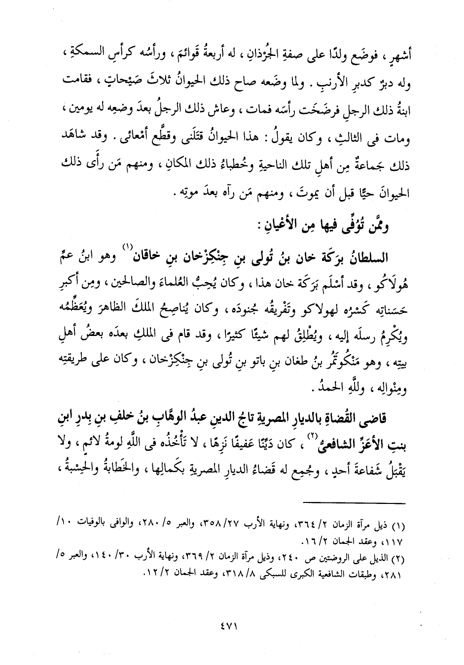 أَشْهُرٍ، فَوَضَعَ وَلَدًا عَلَى صِفَةِ الْجُرْذَانِ، لَهُ أَرْبَعَةُ قَوَائِمَ وَرَأْسُهُ كَرَأْسِ السَّمَكَةِ، وَلَهُ دُبُرٌ كَدُبُرِ الْأَرْنَبِ. وَلَمَّا وَضَعَهُ صَاحَ ذَلِكَ الْحَيَوَانُ ثَلَاثَ صَيْحَاتٍ، فَقَامَتِ ابْنَةُ ذَلِكَ الرَّجُلِ فَرَضَخَتْ رَأْسَهُ فَمَاتَ، وَعَاشَ ذَلِكَ الرَّجُلُ بَعْدَ وَضْعِهِ لَهُ يَوْمَيْنِ، وَمَاتَ فِي الثَّالِثِ، وَكَانَ يَقُولُ: هَذَا الْحَيَوَانُ قَتَلَنِي وَقَطَّعَ أَمْعَائِي. وَقَدْ شَاهَدَ ذَلِكَ جَمَاعَةٌ مِنْ أَهْلِ تِلْكَ النَّاحِيَةِ وَخُطَبَاءُ ذَلِكَ الْمَكَانِ، وَمِنْهُمْ مَنْ رَأَى ذَلِكَ الْحَيَوَانَ حَيًّا قَبْلَ أَنْ يَمُوتَ، وَمِنْهُمْ مَنْ رَآهُ بَعْدَ مَوْتِهِ.