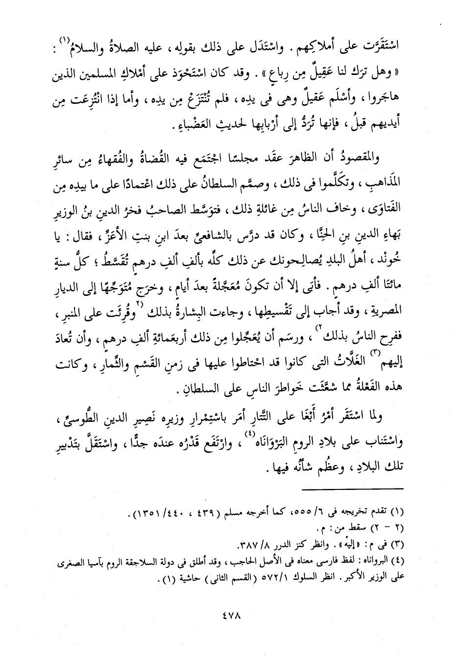 وَالْمَقْصُودُ أَنَّ الظَّاهِرَ عَقَدَ مَجْلِسًا اجْتَمَعَ فِيهِ الْقُضَاةُ وَالْفُقَهَاءُ مِنْ سَائِرِ الْمَذَاهِبِ، وَتَكَلَّمُوا فِي ذَلِكَ، وَصَمَّمَ السُّلْطَانُ عَلَى ذَلِكَ اعْتِمَادًا عَلَى مَا بِيَدِهِ مِنَ الْفَتَاوَى، وَخَافَ النَّاسُ مِنْ غَائِلَةِ ذَلِكَ، فَتَوَسَّطَ الصَّاحِبُ فَخْرُ الدِّينِ بْنُ الْوَزِيرِ بَهَاءِ الدِّينِ بْنِ الْحِنَّا، وَكَانَ قَدْ دَرَّسَ بِالشَّافِعِيِّ بَعْدَ ابْنِ بِنْتِ الْأَعَزِّ، فَقَالَ: يَا خُونْدُ، أَهْلُ الْبَلَدِ يُصَالِحُونَكَ عَنْ ذَلِكَ كُلِّهِ بِأَلْفِ أَلْفِ دِرْهَمٍ تُقَسَّطُ; كُلَّ سَنَةٍ مِائَتَا أَلْفِ دِرْهَمٍ. فَأَبَى إِلَّا أَنْ تَكُونَ مُعَجَّلَةً بَعْدَ أَيَّامٍ، وَخَرَجَ مُتَوَجِّهًا إِلَى الدِّيَارِ الْمِصْرِيَّةِ، وَقَدْ أَجَابَ إِلَى تَقْسِيطِهَا، وَجَاءَتِ الْبِشَارَةُ بِذَلِكَ وَقُرِئَتْ عَلَى الْمِنْبَرِ، فَفَرِحَ النَّاسُ بِذَلِكَ، وَرَسَمَ أَنْ يُعَجِّلُوا مِنْ ذَلِكَ أَرْبَعَمِائَةِ أَلْفِ دِرْهَمٍ، وَأَنْ تُعَادَ إِلَيْهِمُ الْغَلَّاتُ الَّتِي كَانُوا قَدِ احْتَاطُوا عَلَيْهَا فِي زَمَنِ الْقَسْمِ وَالثِّمَارِ، وَكَانَتْ هَذِهِ الْفَعْلَةُ مِمَّا شَعَّثَتْ خَوَاطِرَ النَّاسِ عَلَى السُّلْطَانِ.