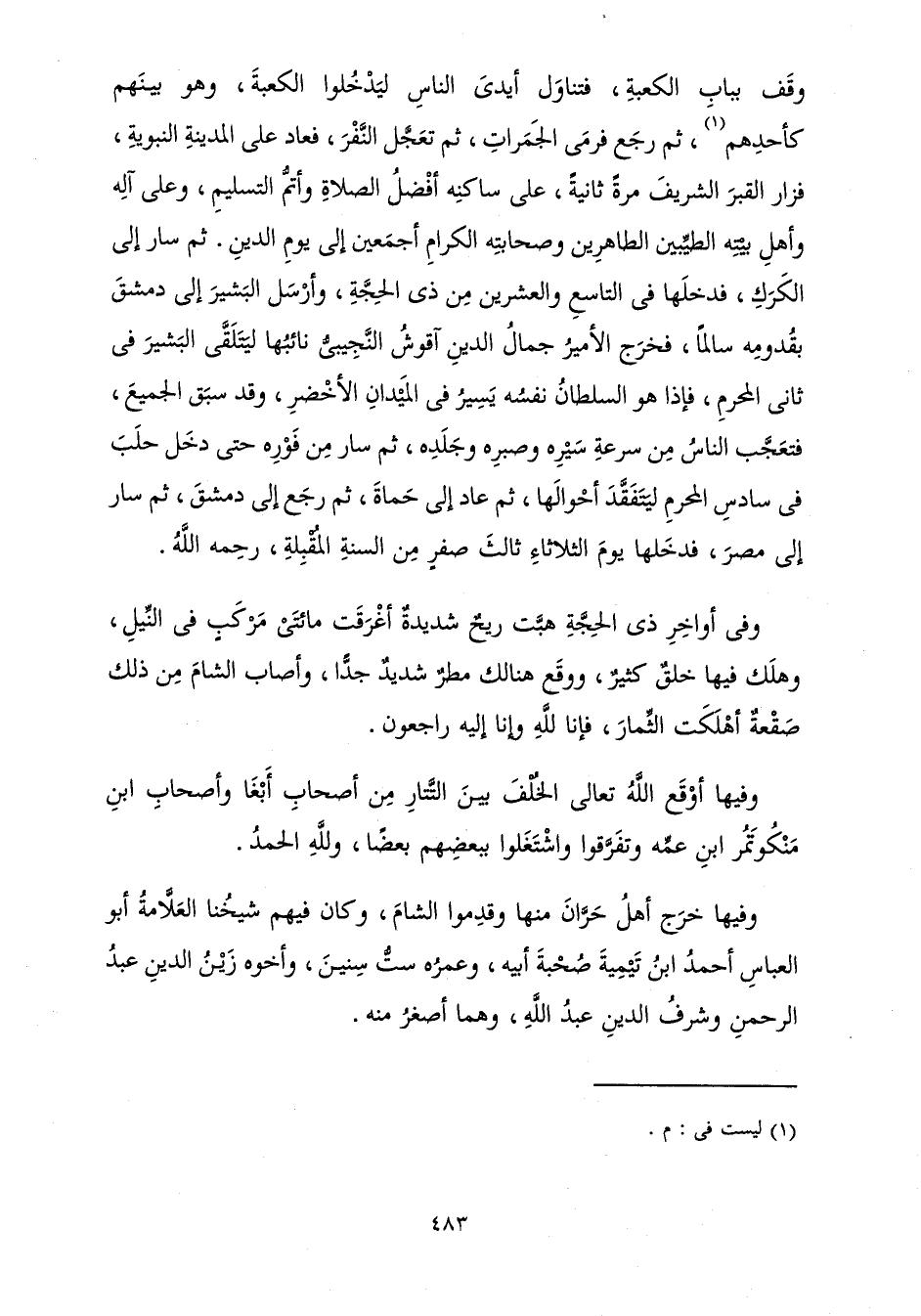 وَفِيهَا خَرَجَ أَهْلُ حَرَّانَ مِنْهَا، وَقَدِمُوا الشَّامَ وَكَانَ فِيهِمْ شَيْخُنَا الْعَلَّامَةُ أَبُو الْعَبَّاسِ أَحْمَدُ ابْنُ تَيْمِيَّةَ صُحْبَةَ أَبِيهِ، وَعُمْرُهُ سِتُّ سِنِينَ، وَأَخُوهُ زَيْنُ الدِّينِ عَبْدُ الرَّحْمَنِ وَشَرَفُ الدِّينِ عَبْدُ اللَّهِ، وَهُمَا أَصْغَرُ مِنْهُ.