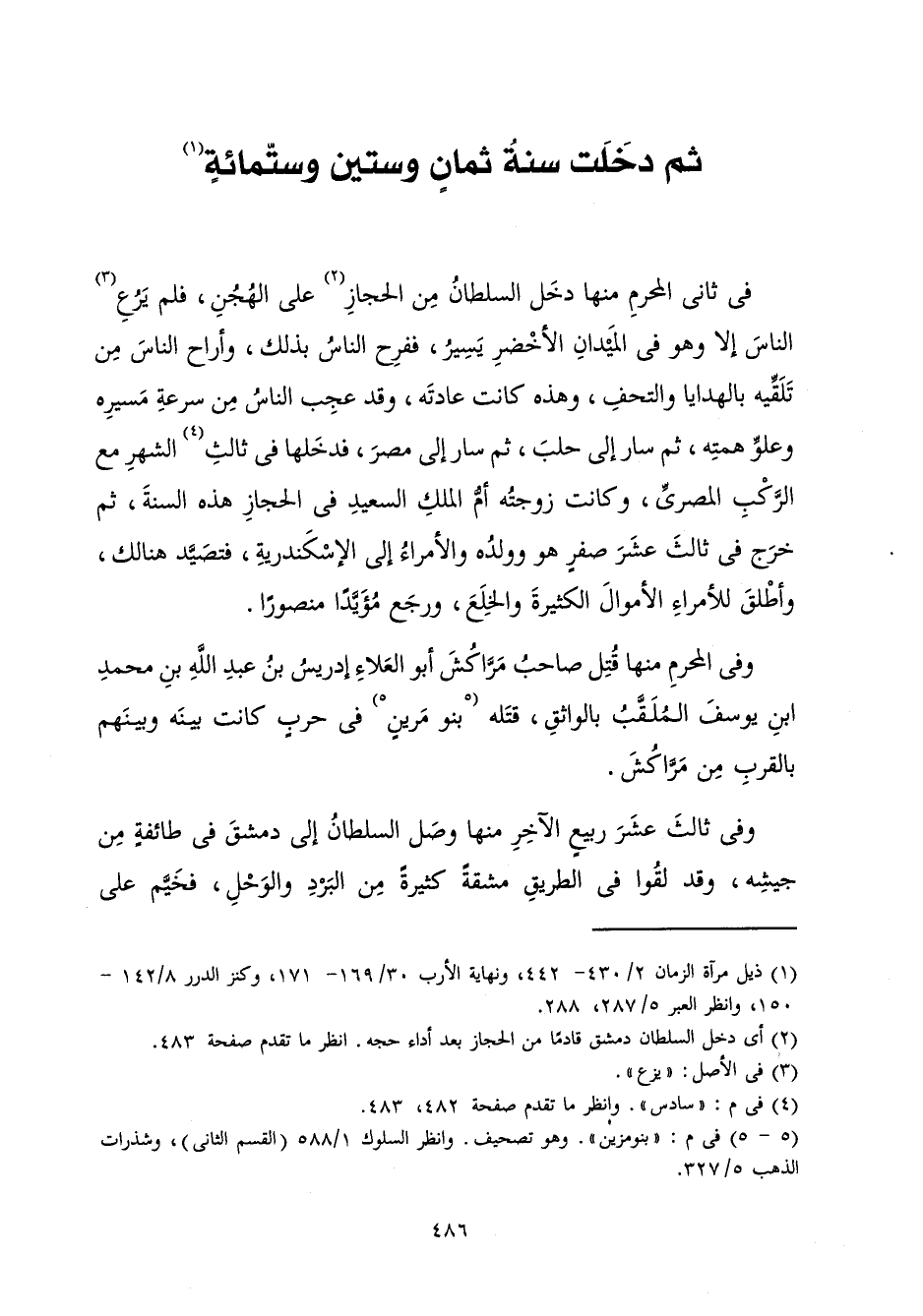 فِي ثَانِي الْمُحَرَّمِ مِنْهَا دَخَلَ السُّلْطَانُ مِنَ الْحِجَازِ عَلَى الْهُجُنِ، فَلَمْ يَرُعِ النَّاسَ إِلَّا وَهُوَ فِي الْمَيْدَانِ الْأَخْضَرِ يَسِيرُ، فَفَرِحَ النَّاسُ بِذَلِكَ، وَأَرَاحَ النَّاسَ مِنْ تَلَقِّيهِ بِالْهَدَايَا وَالتُّحَفِ، وَهَذِهِ كَانَتْ عَادَتُهُ، وَقَدْ عَجِبَ النَّاسُ مِنْ سُرْعَةِ مَسِيرِهِ وَعُلُوِّ هِمَّتِهِ، ثُمَّ سَارَ إِلَى حَلَبَ، ثُمَّ سَارَ إِلَى مِصْرَ، فَدَخَلَهَا فِي ثَالِثِ الشَّهْرِ مَعَ الرَّكْبِ الْمِصْرِيِّ، وَكَانَتْ زَوْجَتُهُ أُمُّ الْمَلِكِ السَّعِيدِ فِي الْحِجَازِ هَذِهِ السَّنَةَ، ثُمَّ خَرَجَ فِي ثَالِثَ عَشَرَ صَفَرٍ هُوَ وَوَلَدُهُ وَالْأُمَرَاءُ إِلَى الْإِسْكَنْدَرِيَّةِ، فَتَصَيَّدَ هُنَالِكَ، وَأَطْلَقَ لِلْأُمَرَاءِ الْأَمْوَالَ الْكَثِيرَةَ وَالْخُلَعَ، وَرَجَعَ مُؤَيَّدًا مَنْصُورًا.