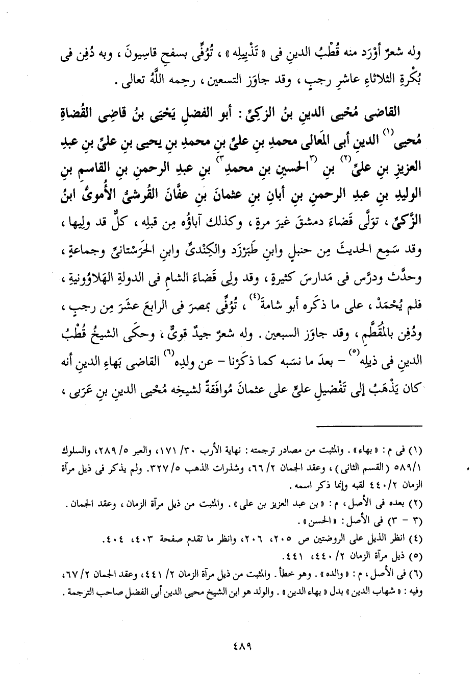 أَبُو الْفَضْلِ يَحْيَى بْنُ قَاضِي الْقُضَاةِ مُحْيِي الدِّينِ أَبِي الْمَعَالِي مُحَمَّدِ بْنِ عَلِيِّ بْنِ مُحَمَّدِ بْنِ يَحْيَى بْنِ عَلِيِّ بْنِ عَبْدِ الْعَزِيزِ بْنِ عَلِيِّ بْنِ الْحُسَيْنِ بْنِ مُحَمَّدِ بْنِ عَبْدِ الرَّحْمَنِ بْنِ الْقَاسِمِ بْنِ الْوَلِيدِ بْنِ عَبْدِ الرَّحْمَنِ بْنِ أَبَانَ بْنِ عُثْمَانَ بْنِ عَفَّانَ الْقُرَشِيُّ الْأُمَوِيُّ ابْنُ الزَّكِيِّ تَوَلَّى قَضَاءَ دِمَشْقَ غَيْرَ مَرَّةٍ، وَكَذَلِكَ آبَاؤُهُ مِنْ قَبْلِهِ، كُلٌّ قَدْ وَلِيَهَا، وَقَدْ سَمِعَ الْحَدِيثَ مِنْ حَنْبَلٍ وَابْنِ طَبَرْزَدَ وَالْكِنْدِيِّ وَابْنِ الْحَرَسْتَانِيِّ وَجَمَاعَةٍ، وَحَدَّثَ وَدَرَّسَ فِي مَدَارِسَ كَثِيرَةٍ، وَقَدْ وَلِيَ قَضَاءَ الشَّامِ فِي الدَّوْلَةِ الْهَلَاوُونِيَّةِ، فَلَمْ يُحْمَدْ عَلَى مَا ذَكَرَهُ أَبُو شَامَةَ، تُوُفِّيَ بِمِصْرَ فِي الرَّابِعَ عَشَرَ مِنْ رَجَبٍ، وَدُفِنَ بِالْمُقَطَّمِ، وَقَدْ جَاوَزَ السَّبْعِينَ. وَلَهُ شِعْرٌ جَيِّدٌ قَوِيٌّ، وَحَكَى الشَّيْخُ قُطْبُ الدِّينِ فِي ذَيْلِهِ - بَعْدَمَا نَسَبَهُ كَمَا ذَكَرْنَا - عَنْ وَلَدِهِ الْقَاضِي بَهَاءِ الدِّينِ أَنَّهُ كَانَ يَذْهَبُ إِلَى تَفْضِيلِ عَلِيٍّ عَلَى عُثْمَانَ مُوَافَقَةً لِشَيْخِهِ مُحْيِي الدِّينِ بْنِ عَرَبِيٍّ
