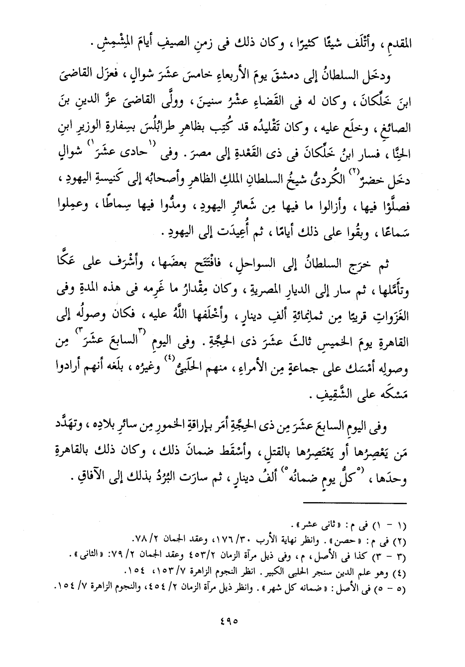 ثُمَّ خَرَجَ السُّلْطَانُ إِلَى السَّوَاحِلِ، فَافْتَتَحَ بَعْضَهَا، وَأَشْرَفَ عَلَى عَكَّا وَتَأَمَّلَهَا، ثُمَّ سَارَ إِلَى الدِّيَارِ الْمِصْرِيَّةِ، وَكَانَ مِقْدَارُ مَا غَرِمَهُ فِي هَذِهِ الْمُدَّةِ وَفِي الْغَزَوَاتِ قَرِيبًا مِنْ ثَمَانِمِائَةِ أَلْفِ دِينَارٍ، وَأَخْلَفَهَا اللَّهُ عَلَيْهِ، فَكَانَ وُصُولُهُ إِلَى الْقَاهِرَةِ يَوْمَ الْخَمِيسِ ثَالِثَ عَشَرَ ذِي الْحِجَّةِ. وَفِي الْيَوْمِ السَّابِعَ عَشَرَ مِنْ وُصُولِهِ أَمْسَكَ عَلَى جَمَاعَةٍ مِنَ الْأُمَرَاءِ مِنْهُمُ، الْحَلَبِيُّ وَغَيْرُهُ، بَلَغَهُ أَنَّهُمْ أَرَادُوا مَسْكَهُ عَلَى الشَّقِيفِ.