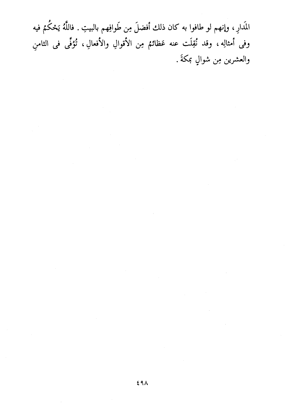 الْمَدَارِ، وَإِنَّهُمْ لَوْ طَافُوا بِهِ كَانَ ذَلِكَ أَفْضَلَ مِنْ طَوَافِهِمْ بِالْبَيْتِ. فَاللَّهُ يَحْكُمُ فِيهِ وَفِي أَمْثَالِهِ، وَقَدْ نُقِلَتْ عَنْهُ عَظَائِمُ مِنَ الْأَقْوَالِ وَالْأَفْعَالِ، تُوُفِّيَ فِي الثَّامِنِ وَالْعِشْرِينَ مِنْ شَوَّالٍ بِمَكَّةَ.