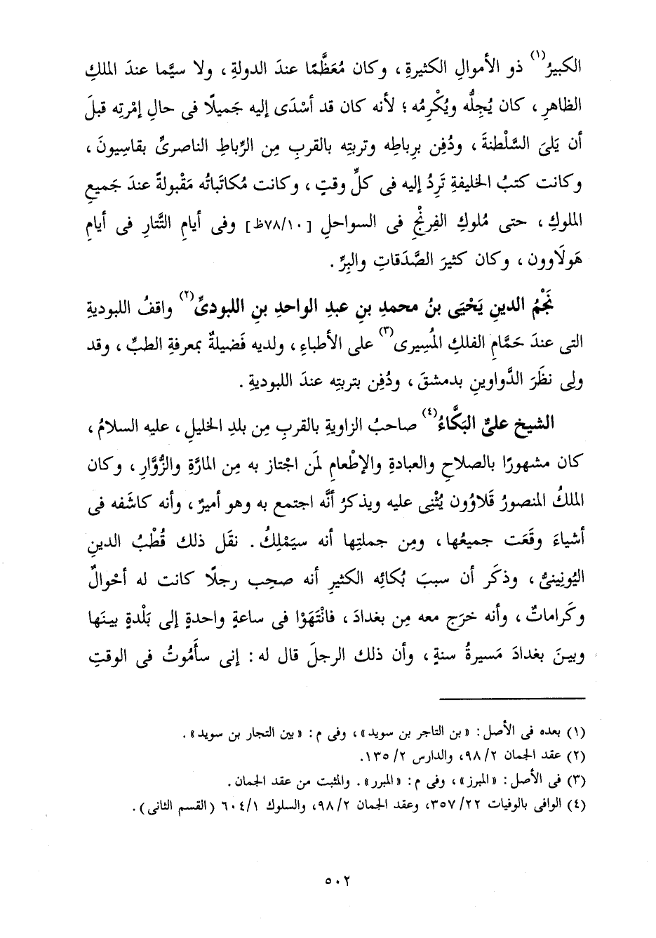 الْكَبِيرُ ذُو الْأَمْوَالِ الْكَثِيرَةِ، وَكَانَ مُعَظَّمًا عِنْدَ الدَّوْلَةِ، وَلَا سِيَّمَا عِنْدَ الْمَلِكِ الظَّاهِرِ، كَانَ يُجِلُّهُ وَيُكْرِمُهُ; لِأَنَّهُ كَانَ قَدْ أَسْدَى إِلَيْهِ جَمِيلًا فِي حَالِ إِمْرَتِهِ قَبْلَ أَنْ يَلِيَ السَّلْطَنَةَ، وَدُفِنَ بِرِبَاطِهِ وَتُرْبَتِهِ بِالْقُرْبِ مِنَ الرِّبَاطِ النَّاصِرِيِّ بِقَاسِيُونَ، وَكَانَتْ كُتُبُ الْخَلِيفَةِ تَرِدُ إِلَيْهِ فِي كُلِّ وَقْتٍ، وَكَانَتْ مُكَاتَبَاتُهُ مَقْبُولَةً عِنْدَ جَمِيعِ الْمُلُوكِ، حَتَّى مُلُوكِ الْفِرِنْجِ فِي السَّوَاحِلِ وَفِي أَيَّامِ التَّتَارِ فِي أَيَّامِ هُولَاوُونَ، وَكَانَ كَثِيرَ الصَّدَقَاتِ وَالْبِرِّ.