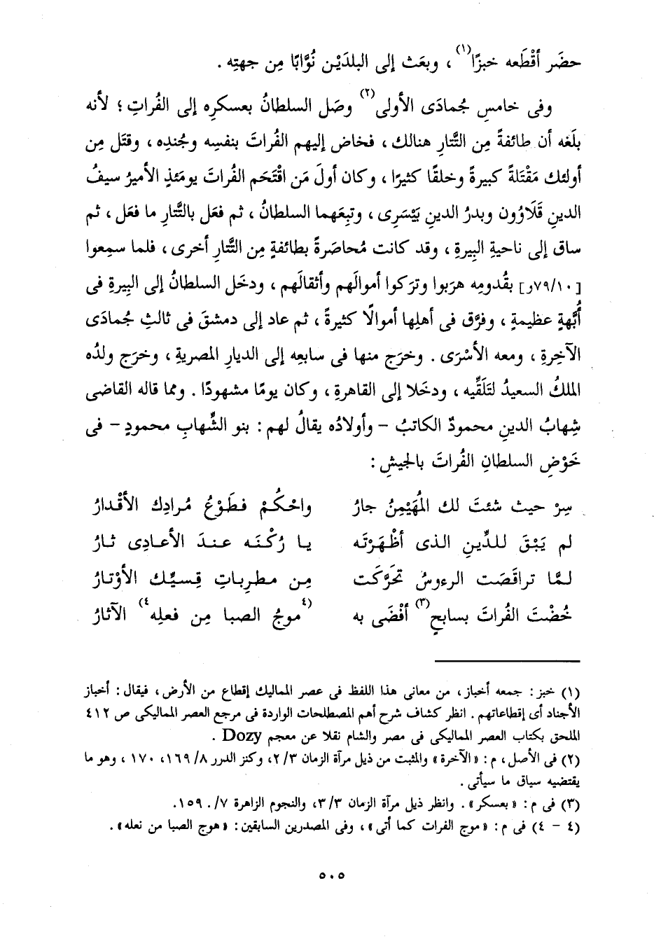 وَفِي خَامِسِ جُمَادَى الْأُولَى وَصَلَ السُّلْطَانُ بِعَسْكَرِهِ إِلَى الْفُرَاتِ; لِأَنَّهُ بَلَغَهُ أَنَّ طَائِفَةً مِنَ التَّتَارِ هُنَالِكَ، فَخَاضَ إِلَيْهِمُ الْفُرَاتَ بِنَفْسِهِ وَجُنْدِهِ، وَقَتَلَ مِنْ أُولَئِكَ مَقْتَلَةً كَبِيرَةً وَخَلْقًا كَثِيرًا، وَكَانَ أَوَّلُ مَنِ اقْتَحَمَ الْفُرَاتَ يَوْمَئِذٍ الْأَمِيرُ سَيْفُ الدِّينِ قَلَاوُونُ وَبَدْرُ الدِّينِ بَيْسَرِيُّ، وَتَبِعَهُمَا السُّلْطَانُ، ثُمَّ فَعَلَ بِالتَّتَارِ مَا فَعَلَ، ثُمَّ سَاقَ إِلَى نَاحِيَةِ الْبِيرَةِ، وَقَدْ كَانَتْ مُحَاصَرَةً بِطَائِفَةٍ مِنَ التَّتَارِ أُخْرَى، فَلَمَّا سَمِعُوا بِقُدُومِهِ هَرَبُوا وَتَرَكُوا أَمْوَالَهُمْ وَأَثْقَالَهُمْ، وَدَخَلَ السُّلْطَانُ إِلَى الْبِيرَةِ فِي أُبَّهَةٍ عَظِيمَةٍ، وَفَرَّقَ فِي أَهْلِهَا أَمْوَالًا كَثِيرَةً، ثُمَّ عَادَ إِلَى دِمَشْقَ فِي ثَالِثِ جُمَادَى الْآخِرَةِ وَمَعَهُ الْأَسْرَى. وَخَرَجَ مِنْهَا فِي سَابِعِهِ إِلَى الدِّيَارِ الْمِصْرِيَّةِ، وَخَرَجَ وَلَدُهُ الْمَلِكُ السَّعِيدُ لِتَلَقِّيهِ، وَدَخَلَا إِلَى الْقَاهِرَةِ وَكَانَ يَوْمًا مَشْهُودًا. وَمِمَّا قَالَهُ الْقَاضِي شِهَابُ الدِّينِ مَحْمُودٌ الْكَاتِبُ - وَأَوْلَادُهُ يُقَالُ لَهُمْ: بَنُو الشِّهَابِ مَحْمُودٍ - فِي خَوْضِ السُّلْطَانِ الْفُرَاتَ بِالْجَيْشِ: