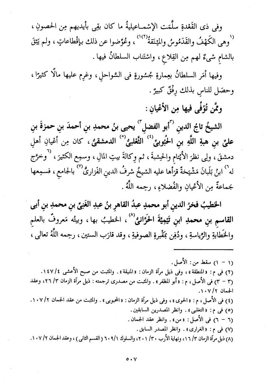 وَفِي ذِي الْقَعْدَةِ سَلَّمَتِ الْإِسْمَاعِيلِيَّةُ مَا كَانَ بَقِيَ بِأَيْدِيهِمْ مِنَ الْحُصُونِ، وَهِيَ الْكَهْفُ وَالْقَدَمُوسُ وَالْمَيْنَقَةُ، وَعُوِّضُوا عَنْ ذَلِكَ بِإِقْطَاعَاتٍ، وَلَمْ يَبْقَ بِالشَّامِ شَيْءٌ لَهُمْ مِنَ الْقِلَاعِ، وَاسْتَنَابَ السُّلْطَانُ فِيهَا.