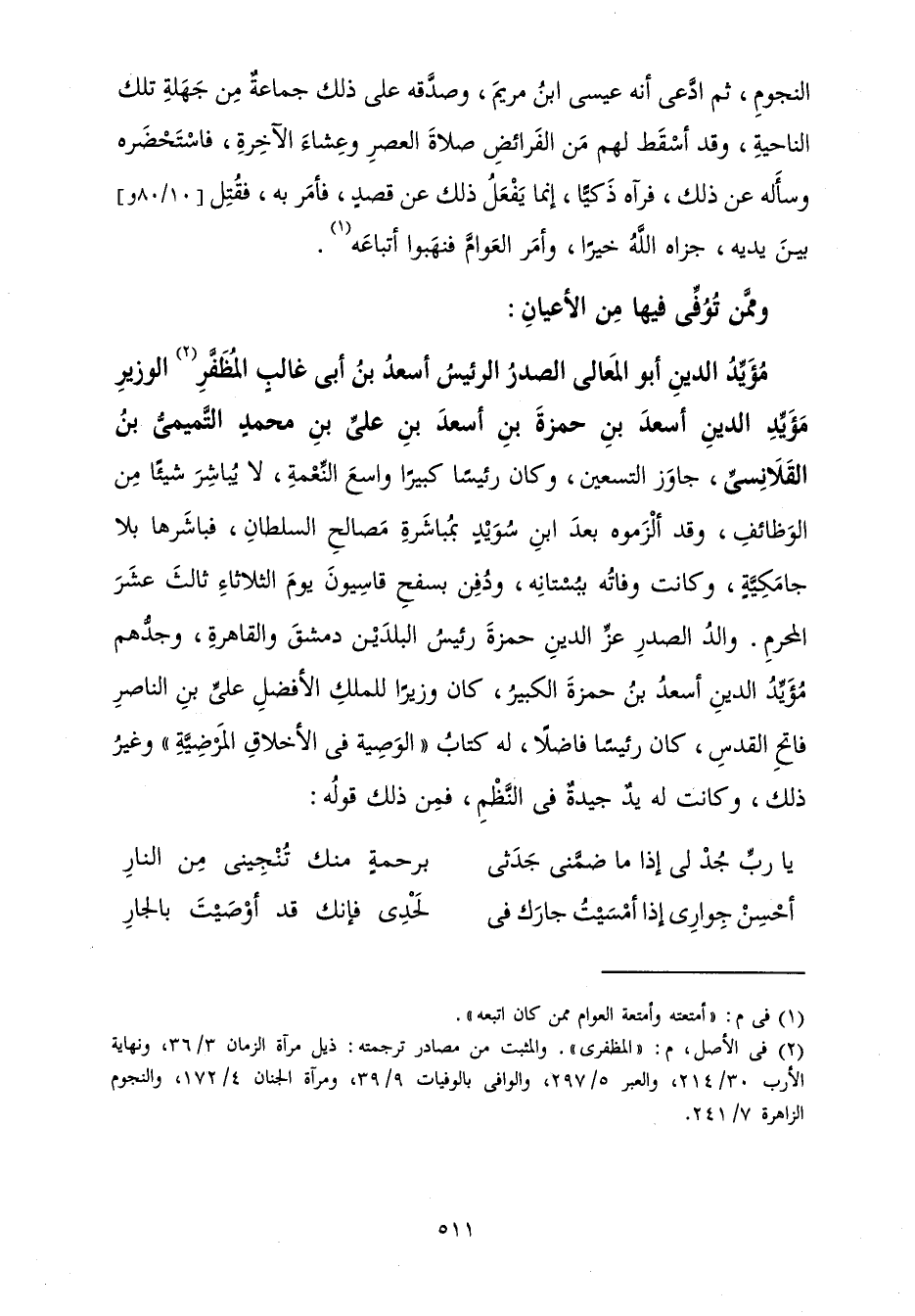 النُّجُومِ، ثُمَّ ادَّعَى أَنَّهُ عِيسَى ابْنُ مَرْيَمَ، وَصَدَّقَهُ عَلَى ذَلِكَ جَمَاعَةٌ مِنْ جَهَلَةِ تِلْكَ النَّاحِيَةِ، وَقَدْ أَسْقَطَ لَهُمْ مِنَ الْفَرَائِضِ صَلَاةَ الْعَصْرِ وَعِشَاءَ الْآخِرَةِ، فَاسْتَحْضَرَهُ وَسَأَلَهُ عَنْ ذَلِكَ فَرَآهُ ذَكِيًّا، إِنَّمَا يَفْعَلُ ذَلِكَ عَنْ قَصْدٍ، فَأَمَرَ بِهِ، فَقُتِلَ بَيْنَ يَدَيْهِ، جَزَاهُ اللَّهُ خَيْرًا، وَأَمَرَ الْعَوَامَّ فَنَهَبُوا أَتْبَاعَهُ.