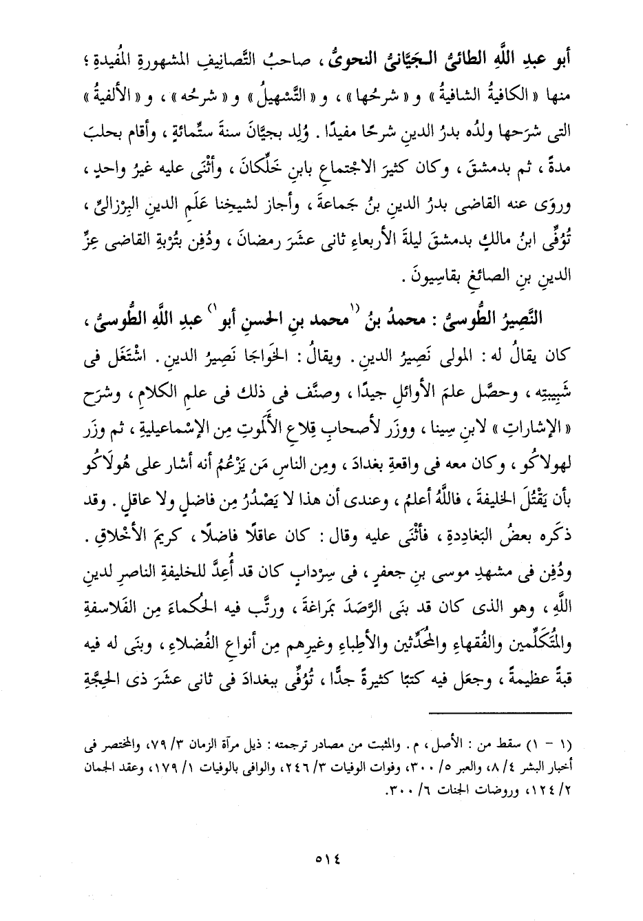 كَانَ يُقَالُ لَهُ: الْمَوْلَى نَصِيرُ الدِّينِ. وَيُقَالُ: الْخَوَاجَا نَصِيرُ الدِّينِ. اشْتَغَلَ فِي شَبِيبَتِهِ، وَحَصَّلَ عِلْمَ الْأَوَائِلِ جَيِّدًا، وَصَنَّفَ فِي ذَلِكَ فِي عِلْمِ الْكَلَامِ، وَشَرَحَ " الْإِشَارَاتِ " لِابْنِ سِينَا، وَوَزَرَ لِأَصْحَابِ قِلَاعِ الْأَلَمُوتِ مِنَ الْإِسْمَاعِيلِيَّةِ، ثُمَّ وَزَرَ لِهُولَاكُو، وَكَانَ مَعَهُ فِي وَاقِعَةِ بَغْدَادَ، وَمِنَ النَّاسِ مَنْ يَزْعُمُ أَنَّهُ أَشَارَ عَلَى هُولَاكُو بِأَنْ يَقْتُلَ الْخَلِيفَةَ، فَاللَّهُ أَعْلَمُ، وَعِنْدِي أَنَّ هَذَا لَا يَصْدُرُ مِنْ فَاضِلٍ وَلَا عَاقِلٍ. وَقَدْ ذَكَرَهُ بَعْضُ الْبَغَادِدَةِ، فَأَثْنَى عَلَيْهِ وَقَالَ: كَانَ عَاقِلًا فَاضِلًا، كَرِيمَ الْأَخْلَاقِ. وَدُفِنَ فِي مَشْهَدِ مُوسَى بْنِ جَعْفَرٍ، فِي سِرْدَابٍ كَانَ قَدْ أُعِدَّ لِلْخَلِيفَةِ النَّاصِرِ لِدِينِ اللَّهِ، وَهُوَ الَّذِي كَانَ قَدْ بَنَى الرَّصَدَ بِمَرَاغَةَ، وَرَتَّبَ فِيهِ الْحُكَمَاءَ مِنَ الْفَلَاسِفَةِ وَالْمُتَكَلِّمِينَ وَالْفُقَهَاءِ وَالْمُحَدِّثِينَ وَالْأَطِبَّاءِ وَغَيْرِهِمْ مِنْ أَنْوَاعِ الْفُضَلَاءِ، وَبَنَى لَهُ فِيهِ قُبَّةً عَظِيمَةً، وَجَعَلَ فِيهِ كُتُبًا كَثِيرَةً جِدًّا، تُوُفِّيَ بِبَغْدَادَ فِي ثَانِي عَشَرَ ذِي الْحِجَّةِ