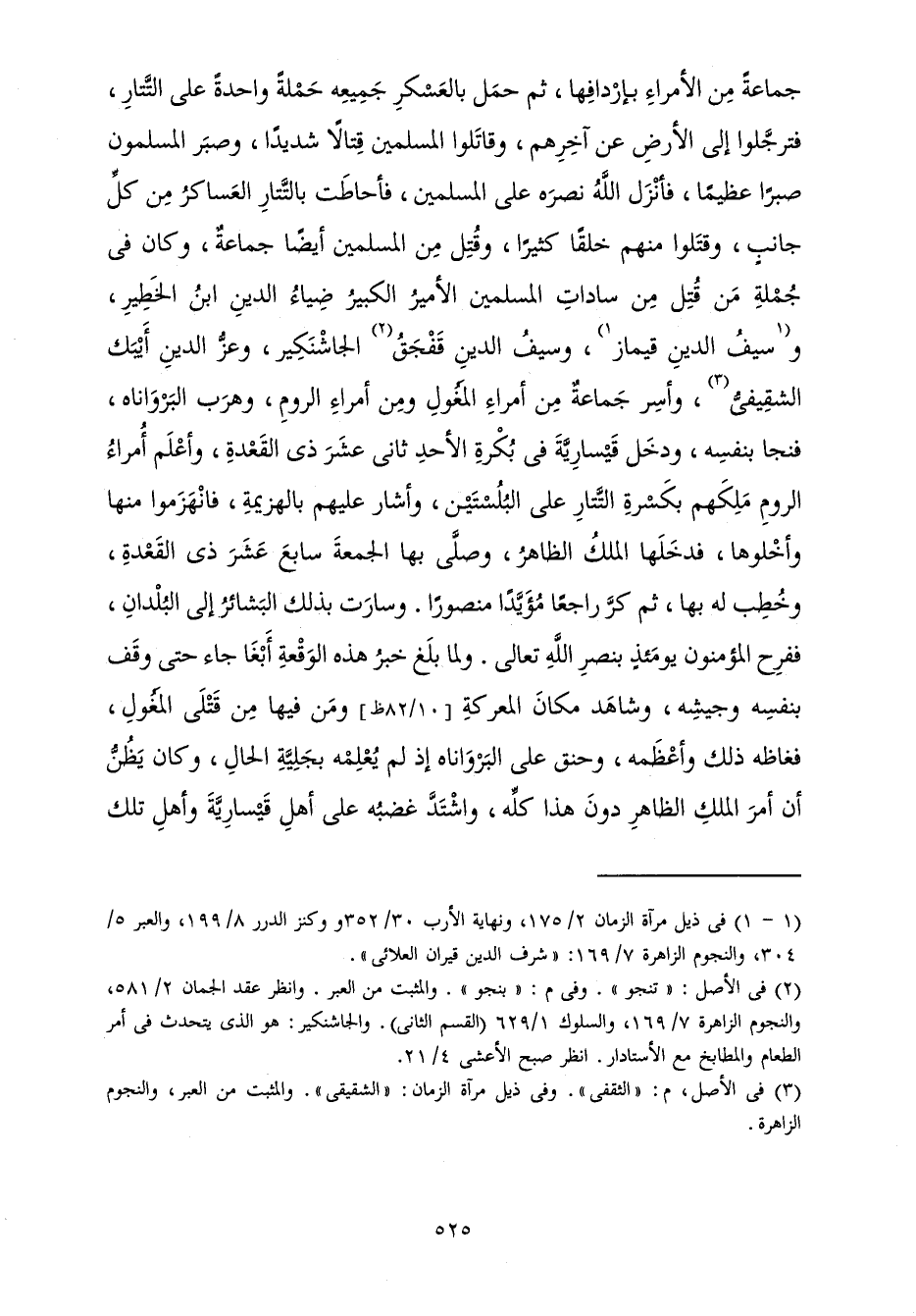 جَمَاعَةً مِنَ الْأُمَرَاءِ بِإِرْدَافِهَا، ثُمَّ حَمَلَ الْعَسْكَرُ جَمِيعُهُ حَمْلَةً وَاحِدَةً عَلَى التَّتَارِ، فَتَرَجَّلُوا إِلَى الْأَرْضِ عَنْ آخِرِهِمْ، وَقَاتَلُوا الْمُسْلِمِينَ قِتَالًا شَدِيدًا، وَصَبَرَ الْمُسْلِمُونَ صَبْرًا عَظِيمًا، فَأَنْزَلَ اللَّهُ نَصْرَهُ عَلَى الْمُسْلِمِينَ، فَأَحَاطَتْ بِالتَّتَارِ الْعَسَاكِرُ مِنْ كُلِّ جَانِبٍ، وَقَتَلُوا مِنْهُمْ خَلْقًا كَثِيرًا، وَقُتِلَ مِنَ الْمُسْلِمِينَ أَيْضًا جَمَاعَةٌ، وَكَانَ فِي جُمْلَةِ مَنْ قُتِلَ مِنْ سَادَاتِ الْمُسْلِمِينَ الْأَمِيرُ الْكَبِيرُ ضِيَاءُ الدِّينِ ابْنُ الْخَطِيرِ، وَسَيْفُ الدِّينِ قَيْمَازٌ، وَسَيْفُ الدِّينِ قَفْجَقُ الْجَاشْنَكِيرُ، وَعِزُّ الدِّينِ أَيْبَكُ الشَّقِيفِيُّ، وَأُسِرَ جَمَاعَةٌ مِنْ أُمَرَاءِ الْمَغُولِ وَمِنْ أُمَرَاءِ الرُّومِ، وَهَرَبَ الْبَرْوَانَاهْ، فَنَجَا بِنَفْسِهِ، وَدَخَلَ قَيْسَارِيَّةَ فِي بُكْرَةِ الْأَحَدِ ثَانِي عَشَرَ ذِي الْقَعْدَةِ، وَأَعْلَمَ أُمَرَاءُ الرُّومِ مَلِكَهُمْ بِكَسْرَةِ التَّتَارِ عَلَى الْبُلُسْتَيْنِ، وَأَشَارَ عَلَيْهِمْ بِالْهَزِيمَةِ، فَانْهَزَمُوا مِنْهَا وَأَخْلَوْهَا، فَدَخَلَهَا الْمَلِكُ الظَّاهِرُ وَصَلَّى بِهَا الْجُمُعَةَ سَابِعَ عَشَرَ ذِي الْقَعْدَةِ، وَخُطِبَ لَهُ بِهَا، ثُمَّ كَرَّ رَاجِعًا مُؤَيَّدًا مَنْصُورًا. وَسَارَتْ بِذَلِكَ الْبَشَائِرُ إِلَى الْبُلْدَانِ، فَفَرِحَ الْمُؤْمِنُونَ يَوْمَئِذٍ بِنَصْرِ اللَّهِ تَعَالَى. وَلَمَّا بَلَغَ خَبَرُ هَذِهِ الْوَقْعَةِ أَبْغَا جَاءَ حَتَّى وَقَفَ بِنَفْسِهِ وَجَيْشِهِ، وَشَاهَدَ مَكَانَ الْمَعْرَكَةِ وَمَنْ فِيهَا مِنْ قَتْلَى الْمَغُولِ، فَغَاظَهُ ذَلِكَ وَأَعْظَمَهُ، وَحَنَقَ عَلَى الْبَرْوَانَاهْ إِذْ لَمْ يُعْلِمْهُ بِجَلِيَّةِ الْحَالِ، وَكَانَ يَظُنُّ أَنَّ أَمْرَ الْمَلِكِ الظَّاهِرِ دُونَ هَذَا كُلِّهِ، وَاشْتَدَّ غَضَبُهُ عَلَى أَهْلِ قَيْسَارِيَّةَ وَأَهْلِ تِلْكَ