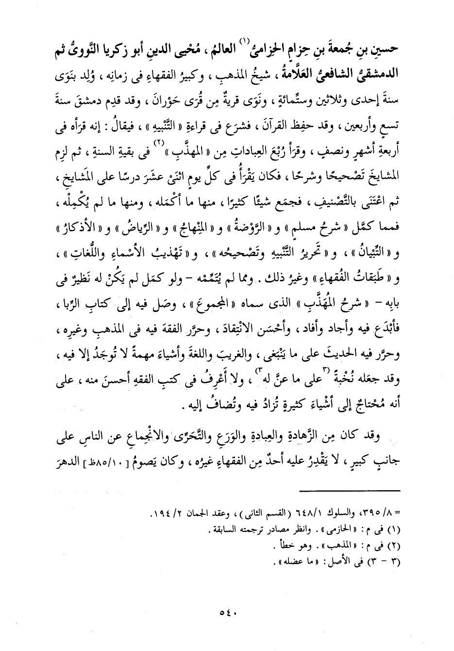 الْعَلَّامَةُ شَيْخُ الْمَذْهَبِ، وَكَبِيرُ الْفُقَهَاءِ فِي زَمَانِهِ، وُلِدَ بِنَوَى سَنَةَ إِحْدَى وَثَلَاثِينَ وَسِتِّمِائَةٍ، وَنَوَى قَرْيَةٌ مِنْ قُرَى حَوْرَانَ، وَقَدْ قَدِمَ دِمَشْقَ سَنَةَ تِسْعٍ وَأَرْبَعِينَ وَقَدْ حَفِظَ الْقُرْآنَ فَشَرَعَ فِي قِرَاءَةِ " التَّنْبِيهِ " فَيُقَالُ: إِنَّهُ قَرَأَهُ فِي أَرْبَعَةِ أَشْهُرٍ وَنِصْفٍ، وَقَرَأَ رُبْعَ الْعِبَادَاتِ مِنَ " الْمُهَذَّبِ " فِي بَقِيَّةِ السَّنَةِ، ثُمَّ لَزِمَ الْمَشَايِخَ تَصْحِيحًا وَشَرْحًا، فَكَانَ يَقْرَأُ فِي كُلِّ يَوْمٍ اثْنَيْ عَشَرَ دَرْسًا عَلَى الْمَشَايِخِ، ثُمَّ اعْتَنَى بِالتَّصْنِيفِ فَجَمَعَ شَيْئًا كَثِيرًا، مِنْهَا مَا أَكْمَلَهُ، وَمِنْهَا مَا لَمْ يُكْمِلْهُ، فَمِمَّا كَمَّلَ " شَرْحُ مُسْلِمٍ " وَ " الرَّوْضَةُ " وَ " الْمِنْهَاجُ " وَ " الرِّيَاضُ " وَ " الْأَذْكَارُ " وَ " التِّبْيَانُ " وَ " تَحْرِيرُ التَّنْبِيهِ وَتَصْحِيحُهُ " وَ " تَهْذِيبُ الْأَسْمَاءِ وَاللُّغَاتِ " وَ " طَبَقَاتُ الْفُقَهَاءِ " وَغَيْرُ ذَلِكَ. وَمِمَّا لَمْ يُتَمِّمْهُ - وَلَوْ كَمَلَ لَمْ يَكُنْ لَهُ نَظِيرٌ فِي بَابِهِ - " شَرْحُ الْمُهَذَّبِ " الَّذِي سَمَّاهُ " الْمَجْمُوعَ " وَصَلَ فِيهِ إِلَى كِتَابِ الرِّبَا، فَأَبْدَعَ فِيهِ وَأَجَادَ وَأَفَادَ وَأَحْسَنَ الِانْتِقَادَ، وَحَرَّرَ الْفِقْهَ فِيهِ فِي الْمَذْهَبِ وَغَيْرِهِ، وَحَرَّرَ فِيهِ الْحَدِيثَ عَلَى مَا يَنْبَغِي، وَالْغَرِيبَ وَاللُّغَةَ وَأَشْيَاءَ مُهِمَّةً لَا تُوجَدُ إِلَّا فِيهِ، وَقَدْ جَعَلَهُ نُخْبَةً عَلَى مَا عَنَّ لَهُ، وَلَا أَعْرِفُ فِي كُتُبِ الْفِقْهِ أَحْسَنَ مِنْهُ، عَلَى أَنَّهُ مُحْتَاجٌ إِلَى أَشْيَاءَ كَثِيرَةٍ تُزَادُ فِيهِ وَتُضَافُ إِلَيْهِ.