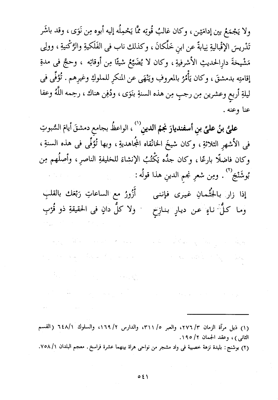 الْوَاعِظُ بِجَامِعِ دِمَشْقَ أَيَّامَ السُّبُوتِ فِي الْأَشْهُرِ الثَّلَاثَةِ، وَكَانَ شَيْخَ الْخَانْقَاهِ الْمُجَاهِدِيَّةِ، وَبِهَا تُوُفِّيَ فِي هَذِهِ السَّنَةِ، وَكَانَ فَاضِلًا بَارِعًا، وَكَانَ جَدُّهُ يَكْتُبُ الْإِنْشَاءَ لِلْخَلِيفَةِ النَّاصِرِ، وَأَصْلُهُمْ مِنْ بُوشَنْجَ. وَمِنْ شِعْرِ نَجْمِ الدِّينِ هَذَا قَوْلُهُ: