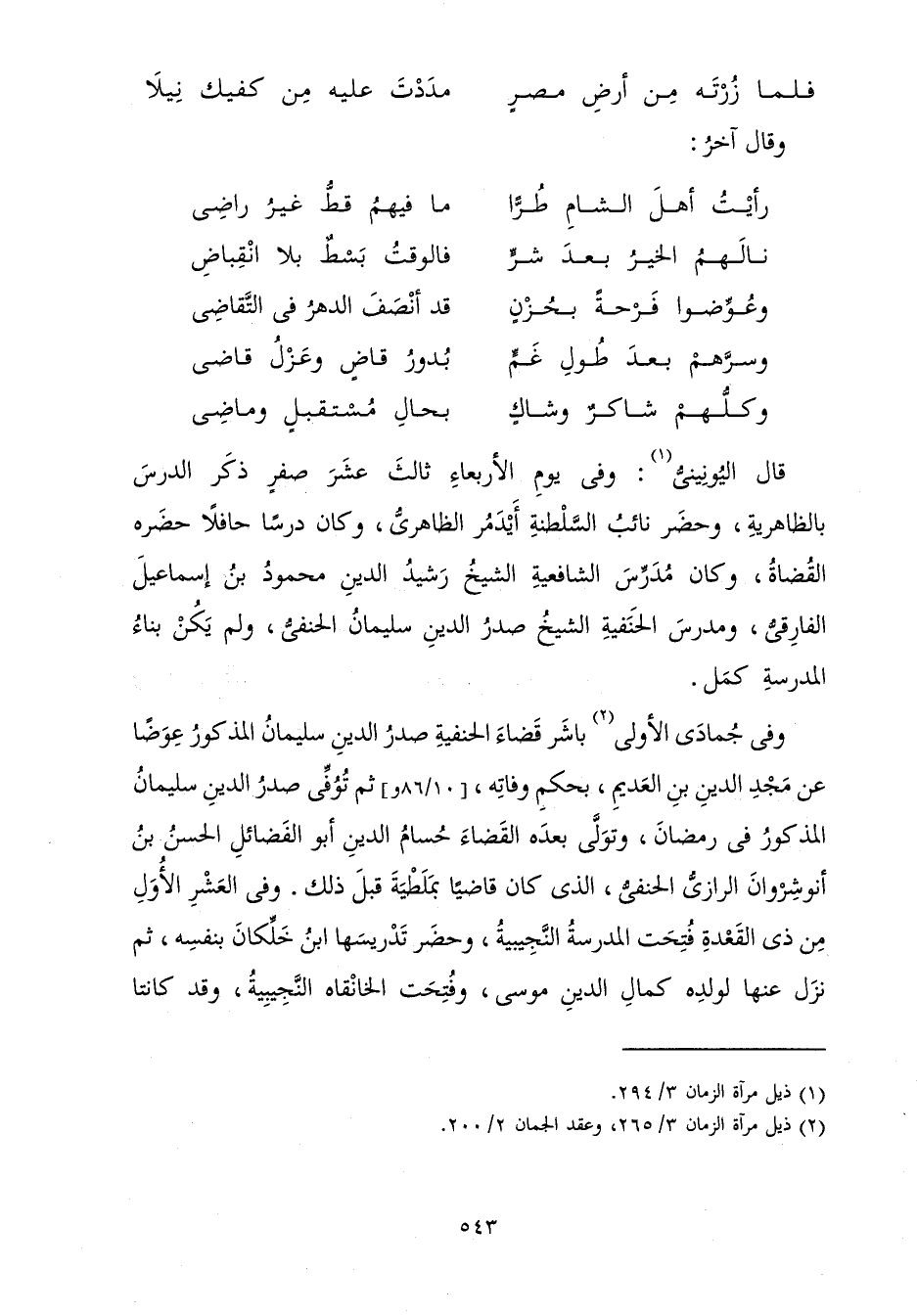 وَفِي جُمَادَى الْأُولَى بَاشَرَ قَضَاءَ الْحَنَفِيَّةِ صَدْرُ الدِّينِ سُلَيْمَانُ الْمَذْكُورُ عِوَضًا عَنْ مَجْدِ الدِّينِ بْنِ الْعَدِيمِ، بِحُكْمِ وَفَاتِهِ، ثُمَّ تُوُفِّيَ صَدْرُ الدِّينِ سُلَيْمَانُ الْمَذْكُورُ فِي رَمَضَانَ، وَتَوَلَّى بَعْدَهُ الْقَضَاءَ حُسَامُ الدِّينِ أَبُو الْفَضَائِلِ الْحَسَنُ بْنُ أَنُوشِرْوَانَ الرَّازِيُّ الْحَنَفِيُّ، الَّذِي كَانَ قَاضِيًا بِمَلَطْيَةَ قَبْلَ ذَلِكَ. وَفِي الْعَشْرِ الْأُوَلِ مِنْ ذِي الْقَعْدَةِ فُتِحَتِ الْمَدْرَسَةُ النَّجِيبِيَّةُ، وَحَضَرَ تَدْرِيسَهَا ابْنُ خَلِّكَانَ بِنَفْسِهِ، ثُمَّ نَزَلَ عَنْهَا لِوَلَدِهِ كَمَالِ الدِّينِ مُوسَى، وَفُتِحَتِ الْخَانْقَاهُ النَّجِيبِيَّةُ، وَقَدْ كَانَتَا