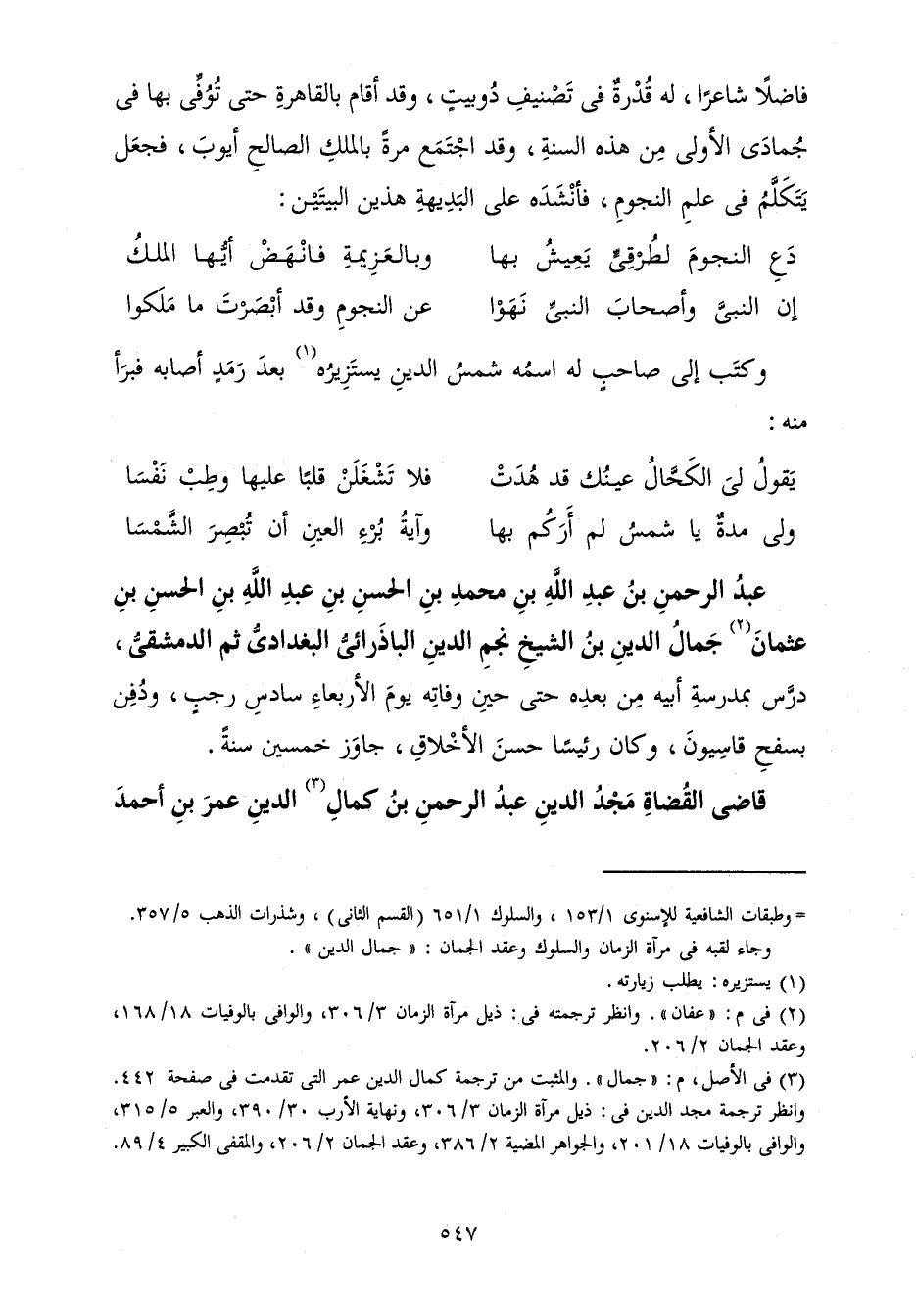 فَاضِلًا شَاعِرًا، لَهُ قُدْرَةٌ فِي تَصْنِيفِ دُوبَيْتٍ، وَقَدْ أَقَامَ بِالْقَاهِرَةِ حَتَّى تُوُفِّيَ بِهَا فِي جُمَادَى الْأُولَى مِنْ هَذِهِ السَّنَةِ، وَقَدِ اجْتَمَعَ مَرَّةً بِالْمَلِكِ الصَّالِحِ أَيُّوبَ، فَجَعَلَ يَتَكَلَّمُ فِي عِلْمِ النُّجُومِ، فَأَنْشَدَهُ عَلَى الْبَدِيهَةِ هَذَيْنِ الْبَيْتَيْنِ: