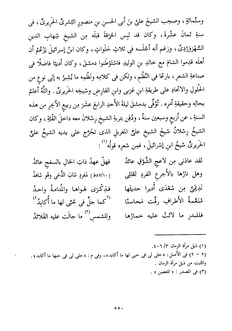 وَسِتِّمِائَةٍ، وَصَحِبَ الشَّيْخَ عَلِيَّ بْنَ أَبِي الْحَسَنِ بْنِ مَنْصُورٍ الْبُسْرِيَّ الْحَرِيرِيَّ، فِي سَنَةِ ثَمَانَ عَشْرَةَ، وَكَانَ قَدْ لَبِسَ الْخِرْقَةَ قَبْلَهُ مِنَ الشَّيْخِ شِهَابِ الدِّينِ السُّهْرَوَرْدِيِّ، وَزَعَمَ أَنَّهُ أَجْلَسَهُ فِي ثَلَاثِ خَلَوَاتٍ، وَكَانَ ابْنُ إِسْرَائِيلَ يَزْعُمُ أَنَّ أَهْلَهُ قَدِمُوا الشَّامَ مَعَ خَالِدِ بْنِ الْوَلِيدِ، فَاسْتَوْطَنُوا دِمَشْقَ، وَكَانَ أَدِيبًا فَاضِلًا فِي صِنَاعَةِ الشِّعْرِ بَارِعًا فِي النَّظْمِ، وَلَكِنْ فِي كَلَامِهِ وَنَظْمِهِ مَا يُشِيرُ بِهِ إِلَى نَوْعٍ مِنَ الْحُلُولِ وَالِاتِّحَادِ عَلَى طَرِيقَةِ ابْنِ عَرَبِيٍّ وَابْنِ الْفَارِضِ وَشَيْخِهِ الْحَرِيرِيِّ. وَاللَّهُ أَعْلَمُ بِحَالِهِ وَحَقِيقَةِ أَمْرِهِ. تُوُفِّيَ بِدِمَشْقَ لَيْلَةَ الْأَحَدِ الرَّابِعَ عَشَرَ مِنْ رَبِيعٍ الْآخِرِ مِنْ هَذِهِ السَّنَةِ، عَنْ أَرْبَعٍ وَسَبْعِينَ سَنَةً، وَدُفِنَ بِتُرْبَةِ الشَّيْخِ رِسْلَانَ مَعَهُ دَاخِلَ الْقُبَّةِ، وَكَانَ الشَّيْخُ رِسْلَانُ شَيْخَ الشَّيْخِ عَلِيٍّ الْمُغَرْبِلِ الَّذِي تَخَرَّجَ عَلَى يَدَيْهِ الشَّيْخُ عَلِيٌّ الْحَرِيرِيُّ شَيْخُ ابْنِ إِسْرَائِيلَ، فَمِنْ شِعْرِهِ قَوْلُهُ: