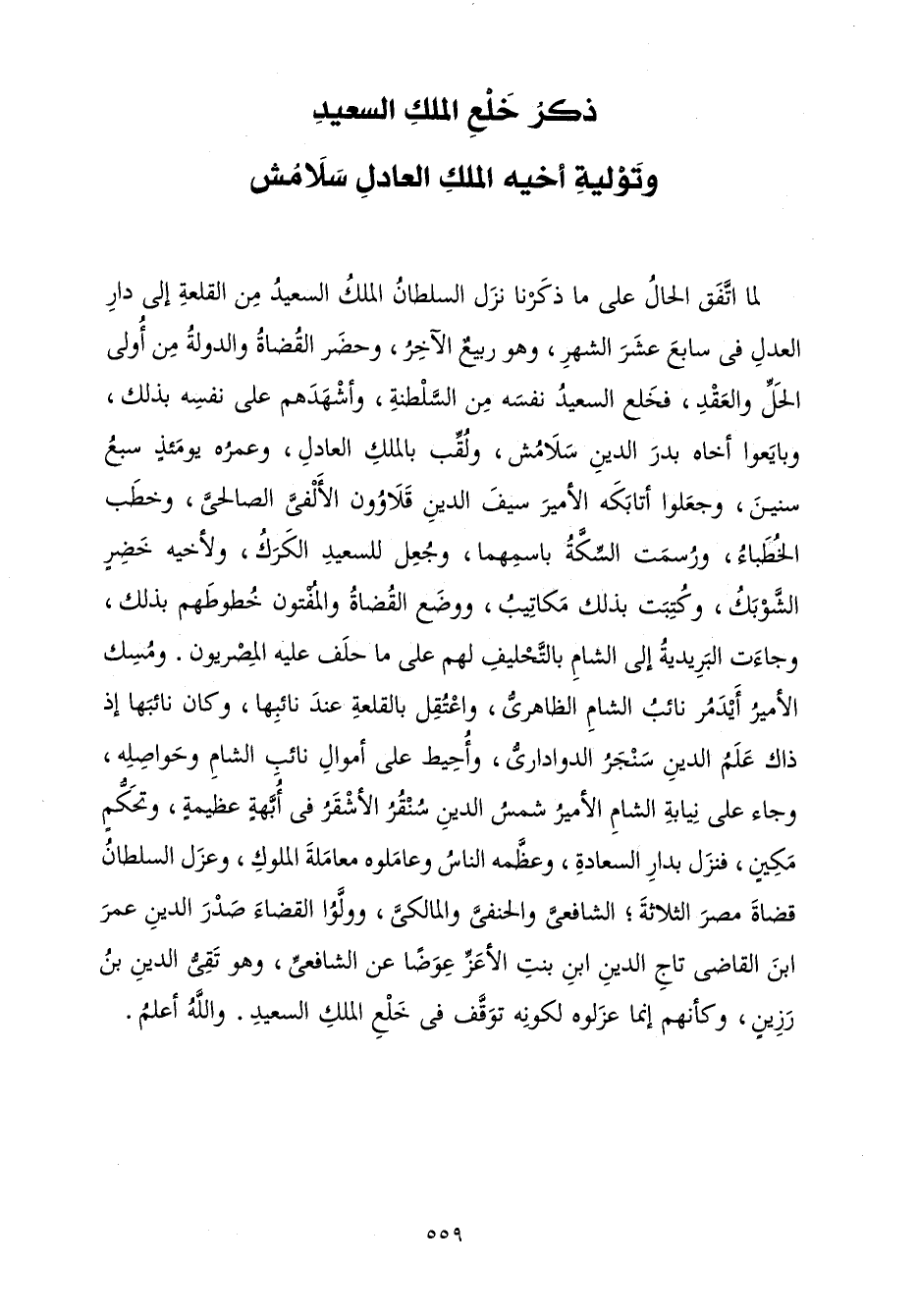 لَمَّا اتَّفَقَ الْحَالُ عَلَى مَا ذَكَرْنَا نَزَلَ السُّلْطَانُ الْمَلِكُ السَّعِيدُ مِنَ الْقَلْعَةِ إِلَى دَارِ الْعَدْلِ فِي سَابِعَ عَشَرَ الشَّهْرِ، وَهُوَ رَبِيعٌ الْآخِرُ، وَحَضَرَ الْقُضَاةُ وَالدَّوْلَةُ مِنْ أُولِي الْحَلِّ وَالْعَقْدِ، فَخَلَعَ السَّعِيدُ نَفْسَهُ مِنَ السَّلْطَنَةِ، وَأَشْهَدَهُمْ عَلَى نَفْسِهِ بِذَلِكَ، وَبَايَعُوا أَخَاهُ بَدْرَ الدِّينِ سَلَامُشَ، وَلُقِّبَ بِالْمَلِكِ الْعَادِلِ، وَعُمْرُهُ يَوْمَئِذٍ سَبْعُ سِنِينَ، وَجَعَلُوا أَتَابِكَهُ الْأَمِيرَ سَيْفَ الدِّينِ قَلَاوُونَ الْأَلْفِيَّ الصَّالِحِيَّ، وَخَطَبَ الْخُطَبَاءُ، وَرَسُمَتِ السِّكَّةُ بِاسْمِهِمَا، وَجُعِلَ لِلسَّعِيدِ الْكَرَكَ، وَلِأَخِيهِ خَضِرٍ الشُّوبَكَ، وَكُتِبَتْ بِذَلِكَ مَكَاتِيبُ، وَوَضَعَ الْقُضَاةُ وَالْمُفْتُونَ خُطُوطَهُمْ بِذَلِكَ، وَجَاءَتِ الْبَرِيدِيَّةُ إِلَى الشَّامِ بِالتَّحْلِيفِ لَهُمْ عَلَى مَا حَلَفَ عَلَيْهِ الْمِصْرِيُّونَ. وَمُسِكَ الْأَمِيرُ أَيْدَمُرُ نَائِبُ الشَّامِ الظَّاهِرِيُّ، وَاعْتُقِلَ بِالْقَلْعَةِ عِنْدَ نَائِبِهَا، وَكَانَ نَائِبَهَا إِذْ ذَاكَ عَلَمُ الدِّينِ سَنْجَرُ الدَّوَادَارِيُّ، وَأُحِيطَ عَلَى أَمْوَالِ نَائِبِ الشَّامِ وَحَوَاصِلِهِ، وَجَاءَ عَلَى نِيَابَةِ الشَّامِ الْأَمِيرُ شَمْسُ الدِّينِ سُنْقُرُ الْأَشْقَرُ فِي أُبَّهَةٍ عَظِيمَةٍ، وَتَحَكُّمٍ مَكِينٍ، فَنَزَلَ بِدَارِ السَّعَادَةِ، وَعَظَّمَهُ النَّاسُ وَعَامَلُوهُ مُعَامَلَةَ الْمُلُوكِ، وَعَزَلَ السُّلْطَانُ قُضَاةَ مِصْرَ الثَّلَاثَةَ; الشَّافِعِيَّ وَالْحَنَفِيَّ وَالْمَالِكِيَّ، وَوَلَّوُا الْقَضَاءَ صَدْرَ الدِّينِ عُمَرَ بْنَ الْقَاضِيِ تَاجِ الدِّينِ ابْنِ بِنْتِ الْأَعَزِّ عِوَضًا عَنِ الشَّافِعِيِّ، وَهُوَ تَقِيُّ الدِّينِ بْنُ رَزِينٍ، وَكَأَنَّهُمْ إِنَّمَا عَزَلُوهُ لِأَنَّهُ تَوَقَّفَ فِي خَلْعِ الْمَلِكِ السَّعِيدِ. وَاللَّهُ أَعْلَمُ.