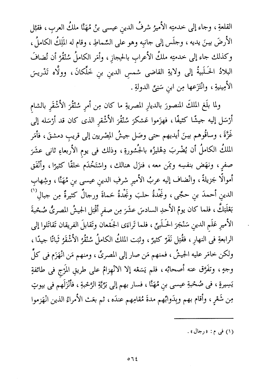 الْقَلْعَةِ، وَجَاءَ إِلَى خِدْمَتِهِ الْأَمِيرُ شَرَفُ الدِّينِ عِيسَى بْنُ مُهَنَّا مِلْكُ الْعَرَبِ، فَقَبَّلَ الْأَرْضَ بَيْنَ يَدَيْهِ، وَجَلَسَ إِلَى جَانِبِهِ وَهُوَ عَلَى السِّمَاطِ، وَقَامَ لَهُ الْمَلِكُ الْكَامِلُ، وَكَذَلِكَ جَاءَ إِلَى خِدْمَتِهِ مَلِكُ الْأَعْرَابِ بِالْحِجَازِ، وَأَمَرَ الْكَامِلُ سُنْقُرُ أَنْ تُضَافَ الْبِلَادُ الْحَلَبِيَّةُ إِلَى وِلَايَةِ الْقَاضِي شَمْسِ الدِّينِ بْنِ خَلِّكَانَ، وَوَلَّاهُ تَدْرِيسَ الْأَمِينِيَّةِ، وَانْتَزَعَهَا مِنِ ابْنِ سَنِيِّ الدَّوْلَةِ.