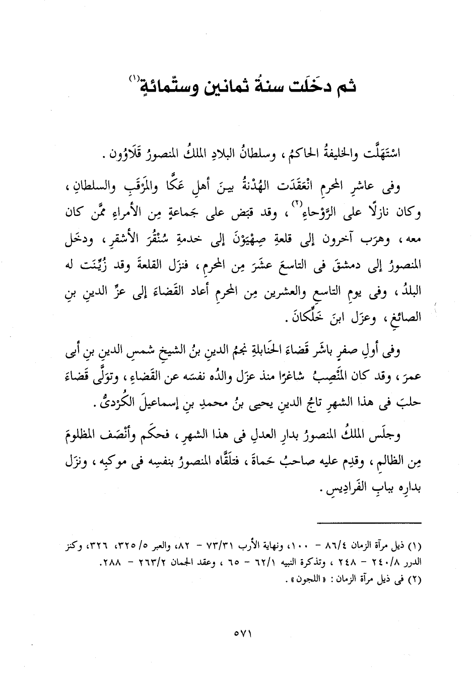 وَجَلَسَ الْمَلِكُ الْمَنْصُورُ بِدَارِ الْعَدْلِ فِي هَذَا الشَّهْرِ، فَحَكَمَ وَأَنْصَفَ الْمَظْلُومَ مِنَ الظَّالِمِ، وَقَدِمَ عَلَيْهِ صَاحِبُ حَمَاةَ، فَتَلَقَّاهُ الْمَنْصُورُ بِنَفْسِهِ فِي مَوْكِبِهِ، وَنَزَلَ بِدَارِهِ بِبَابِ الْفَرَادِيسِ.