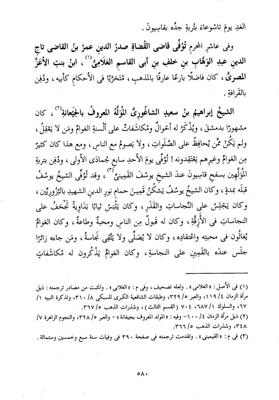 كَانَ مَشْهُورًا بِدِمَشْقَ، وَيُذْكَرُ لَهُ أَحْوَالٌ وَمُكَاشَفَاتٌ عَلَى أَلْسِنَةِ الْعَوَامِّ وَمَنْ لَا يَعْقِلُ، وَلَمْ يَكُنْ مِمَّنْ يُحَافِظْ عَلَى الصَّلَوَاتِ، وَلَا يَصُومُ مَعَ النَّاسِ، وَمَعَ هَذَا كَانَ كَثِيرٌ مِنَ الْعَوَامِّ وَغَيْرِهِمْ يَعْتَقِدُونَهُ! تُوُفِّيَ يَوْمَ الْأَحَدِ سَابِعَ جُمَادَى الْأُولَى، وَدُفِنَ بِتُرْبَةِ الْمُوَلَّهِينَ بِسَفْحِ قَاسِيُونَ عِنْدَ الشَّيْخِ يُوسُفَ الْقَمِينِيِّ، وَقَدْ تُوُفِّيَ الشَّيْخُ يُوسُفُ قَبْلَهُ بِمُدَّةٍ، وَكَانَ الشَّيْخُ يُوسُفُ يَسْكُنُ قَمِينَ حَمَّامِ نُورِ الدِّينِ الشَّهِيدِ بِالْبُزُورِيِّينَ، وَكَانَ يَجْلِسُ عَلَى النَّجَاسَاتِ وَالْقَذَرِ، وَكَانَ يَلْبَسُ ثِيَابًا بَدَاوِيَةً تَجْحَفُ عَلَى النَّجَاسَاتِ فِي الْأَزِقَّةِ، وَكَانَ لَهُ قَبُولٌ مِنَ النَّاسِ وَمَحَبَّةٌ وَطَاعَةٌ، وَكَانَ الْعَوَّامُّ يُغَالُونَ فِي مَحَبَّتِهِ وَاعْتِقَادِهِ، وَكَانَ لَا يُصَلِّي وَلَا يَتَّقِي نَجَاسَةً وَمَنْ جَاءَهُ زَائِرًا جَلَسَ عِنْدَهُ بِالْقَمِينِ عَلَى النَّجَاسَةِ، وَكَانَ الْعَوَامُّ يَذْكُرُونَ لَهُ مُكَاشَفَاتٍ