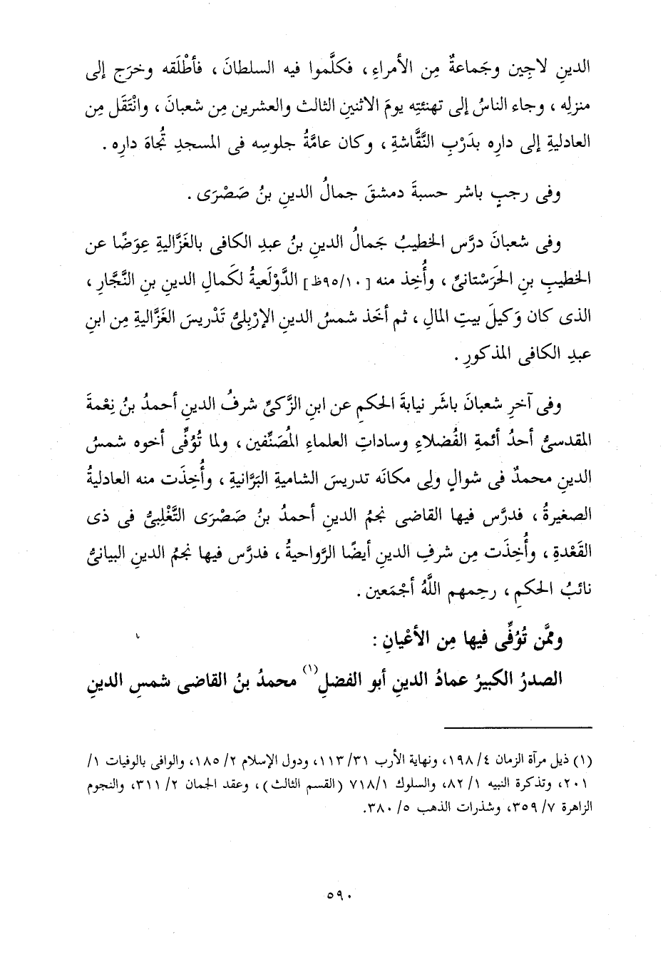 وَفِي شَعْبَانَ دَرَّسَ الْخَطِيبُ جَمَالُ الدِّينِ بْنُ عَبْدِ الْكَافِي بِالْغَزَّالِيَّةِ عِوَضًا عَنِ الْخَطِيبِ ابْنِ الْحَرَسْتَانِيِّ، وَأُخِذَ مِنْهُ الدَّوْلَعِيَّةُ لِكَمَالِ الدِّينِ بْنِ النَّجَّارِ، الَّذِي كَانَ وَكِيلَ بَيْتِ الْمَالِ، ثُمَّ أَخَذَ شَمْسُ الدِّينِ الْإِرْبِلِيُّ تَدْرِيسَ الْغَزَّالِيَّةِ مِنِ ابْنِ عَبْدِ الْكَافِي الْمَذْكُورِ.