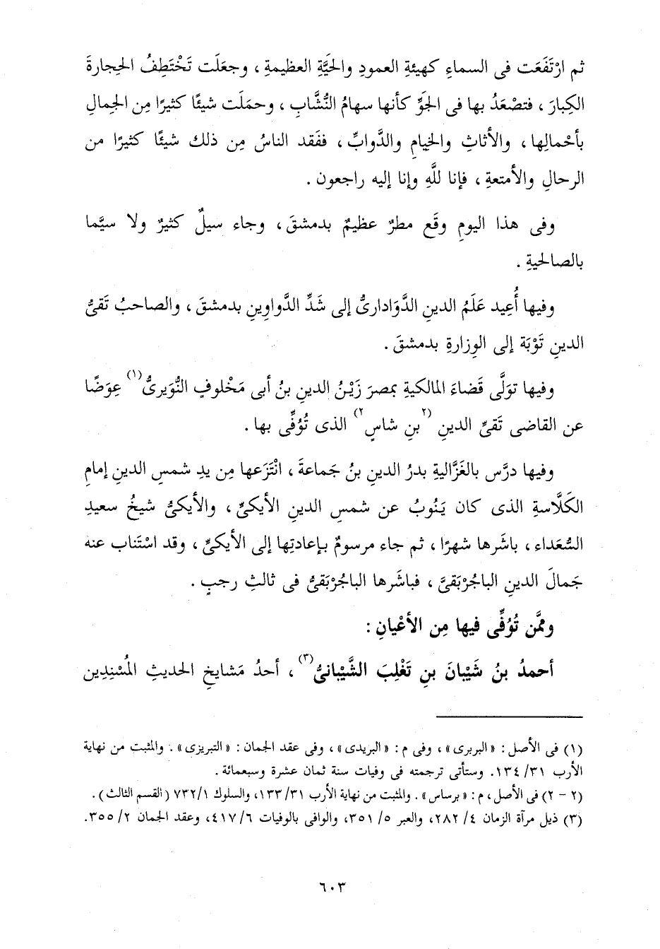 وَفِي هَذَا الْيَوْمِ وَقَعَ مَطَرٌ عَظِيمٌ بِدِمَشْقَ وَجَاءَ سَيْلٌ كَثِيرٌ وَلَا سِيَّمَا بِالصَّالِحِيَّةِ.