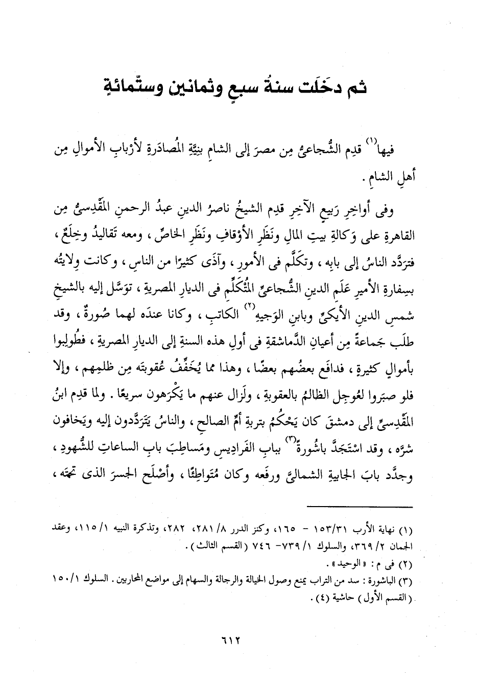 فِيهَا قَدِمَ الشُّجَاعِيُّ مِنْ مِصْرَ إِلَى الشَّامِ بِنِيَّةِ الْمُصَادَرَةِ لِأَرْبَابِ الْأَمْوَالِ مِنْ أَهْلِ الشَّامِ.