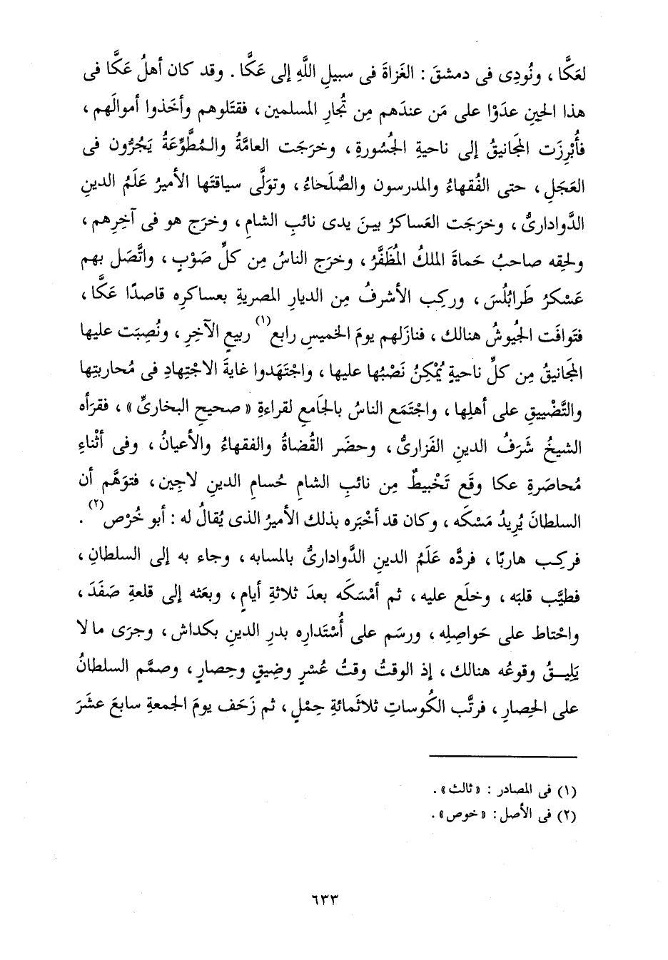 لَعَكَّا، وَنُودِيَ فِي دِمَشْقَ: الْغُزَاةُ فِي سَبِيلِ اللَّهِ إِلَى عَكَّا. وَقَدْ كَانَ أَهْلُ عَكَّا فِي هَذَا الْحِينِ عَدَوْا عَلَى مَنْ عِنْدَهُمْ مِنْ تُجَّارِ الْمُسْلِمِينَ، فَقَتَلُوهُمْ وَأَخَذُوا أَمْوَالَهُمْ، فَأُبْرِزَتِ الْمَجَانِيقُ إِلَى نَاحِيَةِ الْجَسُورَةِ، وَخَرَجَتِ الْعَامَّةُ وَالْمُطَّوِّعَةُ يَجُرُّونَ فِي الْعَجَلِ، حَتَّى الْفُقَهَاءُ وَالْمُدَرِّسُونَ وَالصُّلَحَاءُ، وَتَوَلَّى سِيَاقَتَهَا الْأَمِيرُ عَلَمُ الدِّينِ الدَّوَادَارِيُّ، وَخَرَجَتِ الْعَسَاكِرُ بَيْنَ يَدَيْ نَائِبِ الشَّامِ، وَخَرَجَ هُوَ فِي آخِرِهِمْ، وَلَحِقَهُ صَاحِبُ حَمَاةَ الْمَلِكُ الْمُظَفَّرُ، وَخَرَجَ النَّاسُ مِنْ كُلِّ صَوْبٍ، وَاتَّصَلَ بِهِمْ عَسْكَرُ طَرَابُلُسَ، وَرَكِبَ الْأَشْرَفُ مِنَ الدِّيَارِ الْمِصْرِيَّةِ بِعَسَاكِرِهِ قَاصِدًا عَكَّا، فَتَوَافَتِ الْجُيُوشُ هُنَالِكَ، فَنَازَلَهَا يَوْمَ الْخَمِيسِ رَابِعِ رَبِيعٍ الْآخِرِ، وَنُصِبَتْ عَلَيْهَا الْمَجَانِيقُ مِنْ كُلِّ نَاحِيَةٍ يُمْكِنُ نَصْبُهَا عَلَيْهَا، وَاجْتَهَدُوا غَايَةَ الِاجْتِهَادِ فِي مُحَارَبَتِهَا وَالتَّضْيِيقِ عَلَى أَهْلِهَا، وَاجْتَمَعَ النَّاسُ بِالْجَامِعِ لِقِرَاءَةِ " صَحِيحِ الْبُخَارِيِّ "، فَقَرَأَهُ الشَّيْخُ شَرَفُ الدِّينِ الْفَزَارِيُّ، وَحَضَرَ الْقُضَاةُ وَالْفُضَلَاءُ وَالْأَعْيَانُ، وَفِي أَثْنَاءِ مُحَاصَرَةِ عَكَّا وَقْعَ تَخْبِيطٌ مِنْ نَائِبِ الشَّامِ حُسَامِ الدِّينِ لَاجِينَ، فَتَوَهَّمَ أَنَّ السُّلْطَانَ يُرِيدُ مَسَكَهُ، وَكَانَ قَدْ أَخْبَرَهُ بِذَلِكَ الْأَمِيرُ الَّذِي يُقَالُ لَهُ: أَبُو خُرْصٍ. فَرَكِبَ هَارِبًا فَرَدَّهُ عَلَمُ الدِّينِ الدَّوَادَارِيُّ بِالْمَسَابَهِ، وَجَاءَ بِهِ إِلَى السُّلْطَانِ، فَطَيَّبَ قَلْبَهُ وَخَلَعَ عَلَيْهِ، ثُمَّ أَمْسَكَهُ بَعْدَ ثَلَاثَةِ أَيَّامٍ، وَبَعَثَهُ إِلَى قَلْعَةِ صَفَدَ، وَاحْتَاطَ عَلَى حَوَاصِلِهِ، وَرَسَمَ عَلَى أُسْتَدَارِهِ بَدْرِ الدِّينِ بَكَدَاشَ، وَجَرَى مَا لَا يَلِيقُ وُقُوعُهُ هُنَالِكَ، إِذِ الْوَقْتُ وَقْتُ عُسْرٍ وَضِيقٍ وَحِصَارٍ، وَصَمَّمَ السُّلْطَانُ عَلَى الْحِصَارِ، فَرَتَّبَ الْكُوسَاتِ ثَلَاثَمِائَةِ حِمْلٍ، ثُمَّ زَحَفَ يَوْمَ الْجُمُعَةِ سَابِعَ عَشَرَ